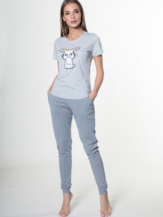 - Стильный дизайн: Футболка украшена милым принтом с кроликом в очках и тонкими горизонтальными полосками, что добавляет образу игривости и индивидуальности. Брюки однотонные, серого цвета, что делает комплект универсальным и сочетаемым.