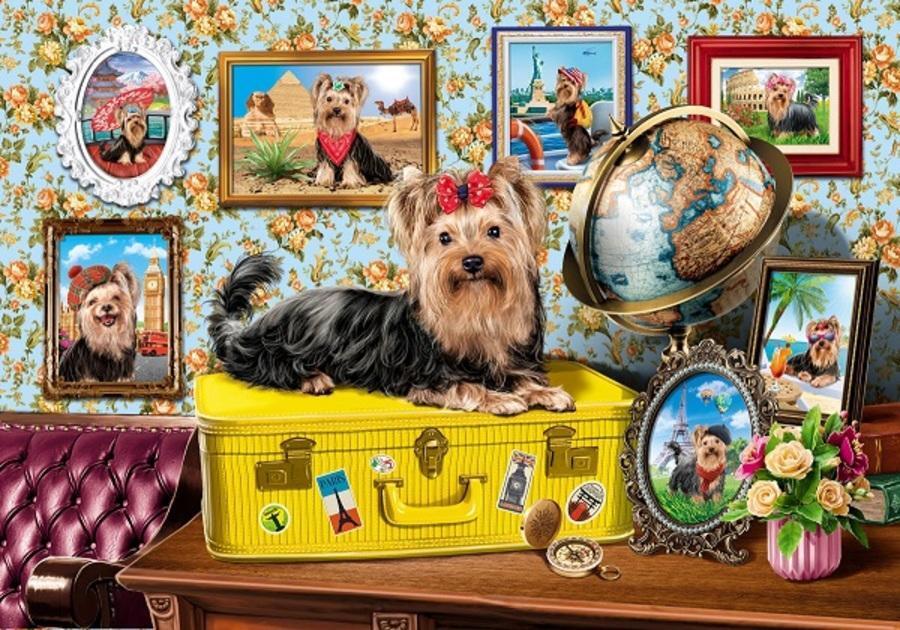 Милый йоркширский терьер на фоне старинного чемодана и глобуса создаст особую атмосферу уюта в интерьере.