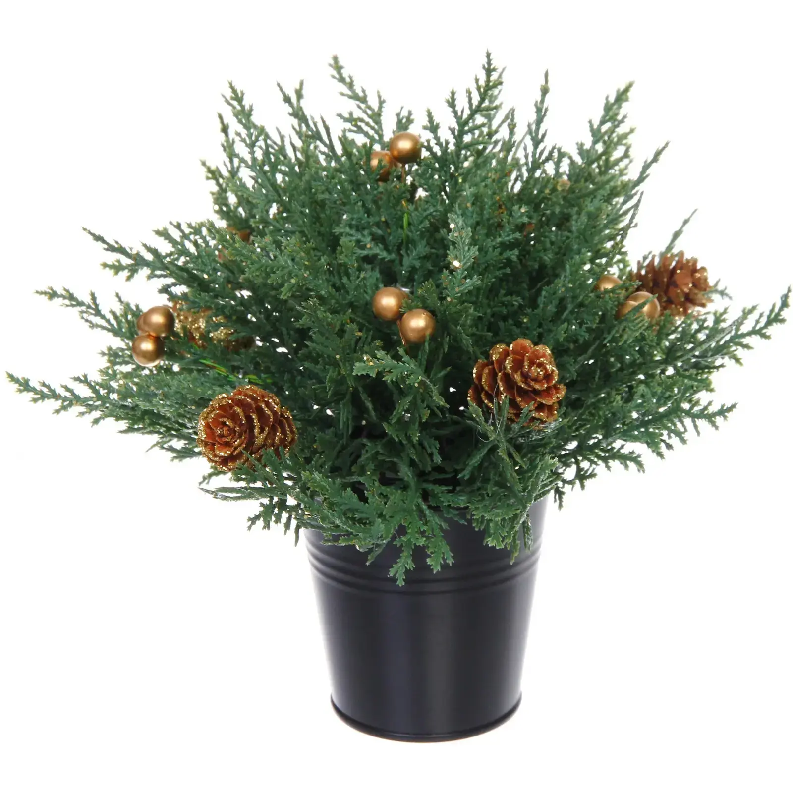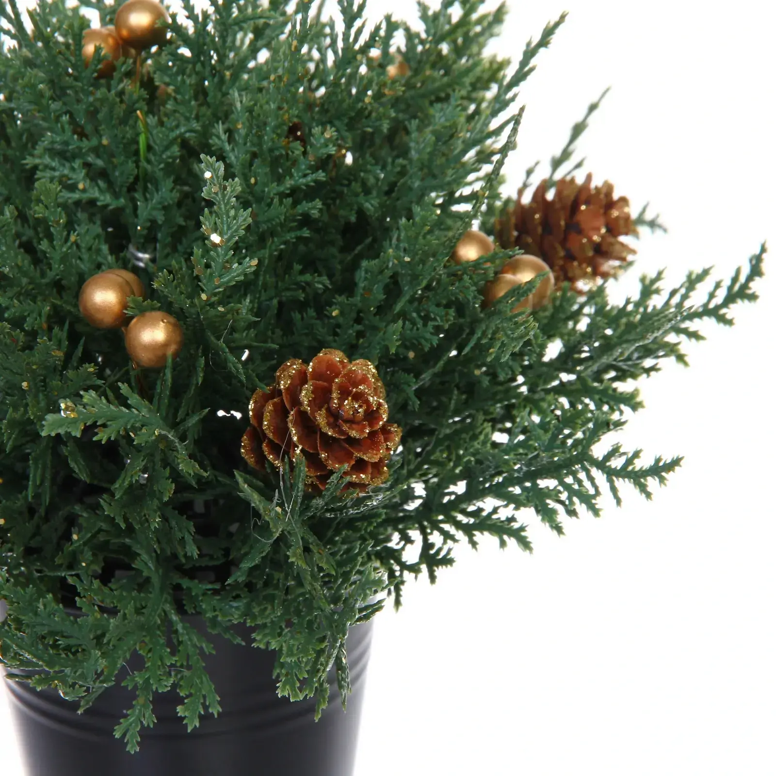 Искусственная хвоя из качественного ПВХ не осыпается и сохраняет презентабельный вид долгие годы. Декоративные элементы – золотистые шары и блестящие шишки – придают композиции праздничный вид без необходимости дополнительного украшения.