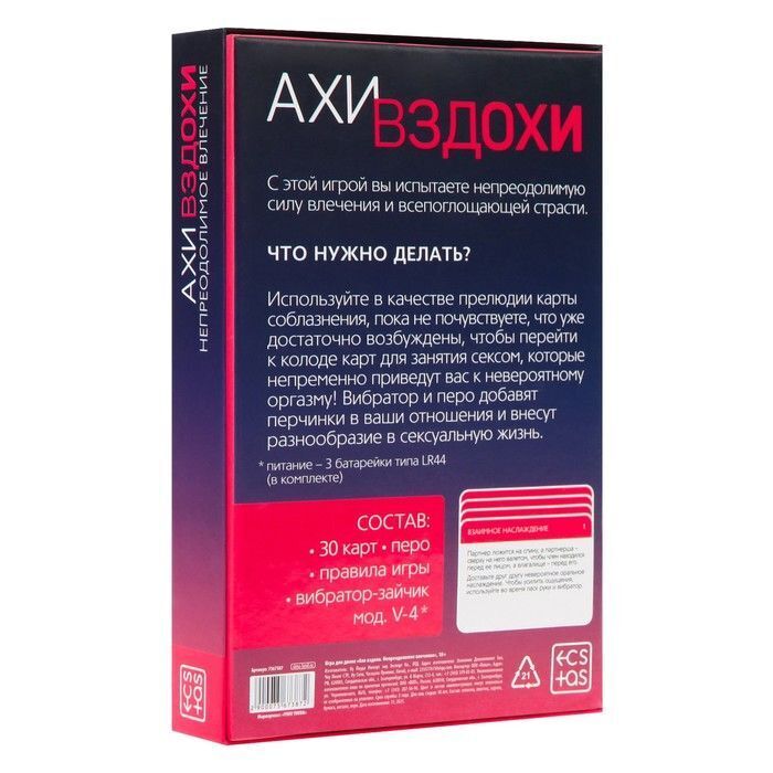 В комплекте: 30 карт, перо, вибратор-зайчик. Цвет: разноцветный. Материал: силикон. Вибрация: есть. Тип и количество батареек: есть в комплекте. Игра предназначена для взрослых и имеет возрастное ограничение 18+.