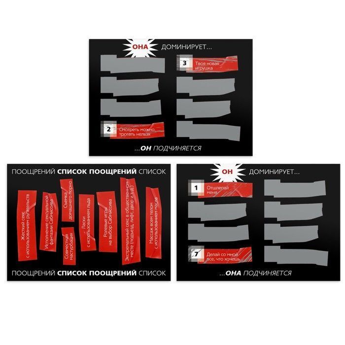 Игра предназначена для взрослых и включает в себя 3 листа с заданиями и 2 листа с расшифровками. Каждый лист содержит уникальные задания, которые помогут вам обмениваться ролями и исследовать свои фантазии. Просто выберите задание, выполните его и наслаждайтесь результатом. Игра подходит для пар, которые хотят добавить остроты в свои отношения и попробовать что-то новое.