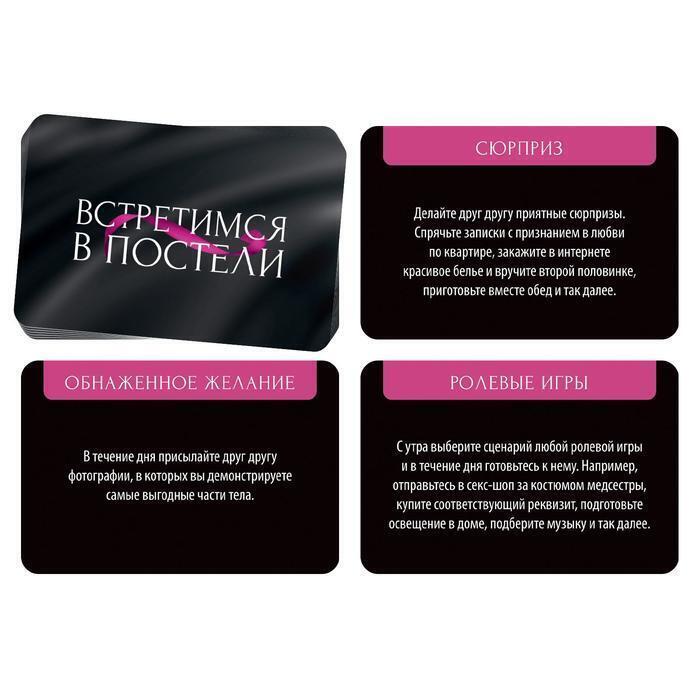 Игра для двоих 'Встретимся в постели' предлагает вам уникальную возможность разнообразить ваши вечера и добавить искры в отношения. Эта игра создана для того, чтобы помочь вам и вашему партнеру исследовать новые грани близости и наслаждения. С 20 увлекательными заданиями, которые вы сможете выполнять в течение дня, вы гарантированно достигнете вершины наслаждения к вечеру.