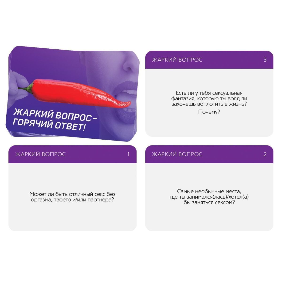 Игра включает 25 карт, каждая из которых содержит уникальный вопрос. Упаковка выполнена в ярком фиолетовом цвете и оформлена с игривым дизайном, что делает её привлекательной для взрослой аудитории. Игра предназначена для лиц старше 18 лет и станет отличным подарком для пары, желающей разнообразить свои вечера.