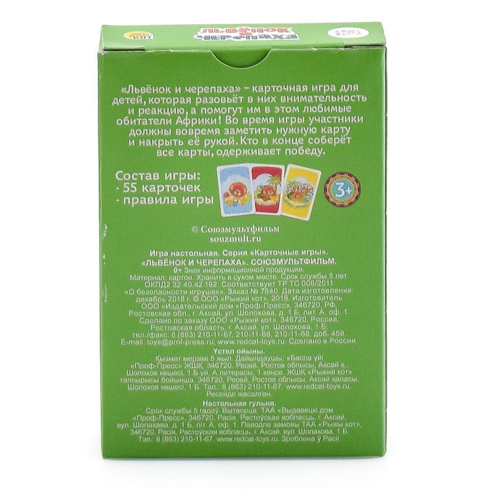 Настольная карточная игра «Львенок и Черепаха» от Рыжий Кот — это яркое развлечение, которое способствует развитию внимательности и реакции у детей от 3 лет. Благодаря простым правилам и увлекательным иллюстрациям, она стимулирует логическое мышление и память, делая игровой процесс интересным и полезным.