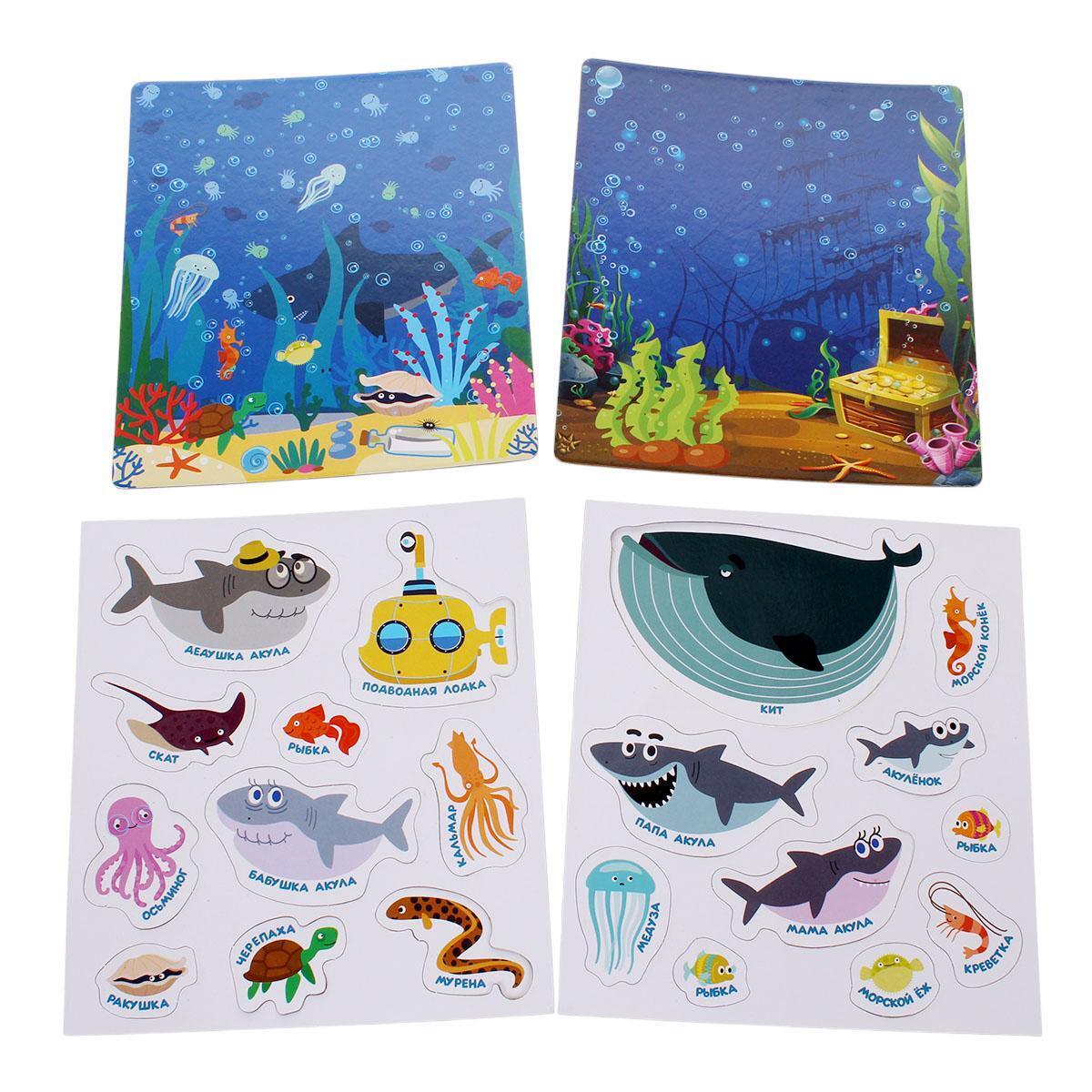 Каждый из 20 магнитных элементов крепится к специальным карточкам-основам. Ребенок создает собственные истории, комбинируя любимых персонажей: акул, осьминогов, рыб и других обитателей моря.