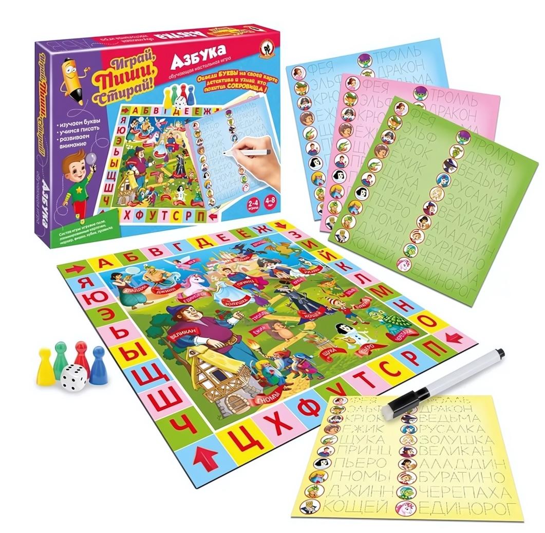 В состав игры входят: 4 многоразовые карточки-прописи, игровое поле с яркими иллюстрациями, 4 фишки различных цветов, кубик и маркер. Все элементы выполнены из безопасных материалов: бумаги, картона и пластмассы. Яркое игровое поле с изображениями персонажей и буквами русского алфавита привлекает внимание детей и делает процесс обучения более интересным.