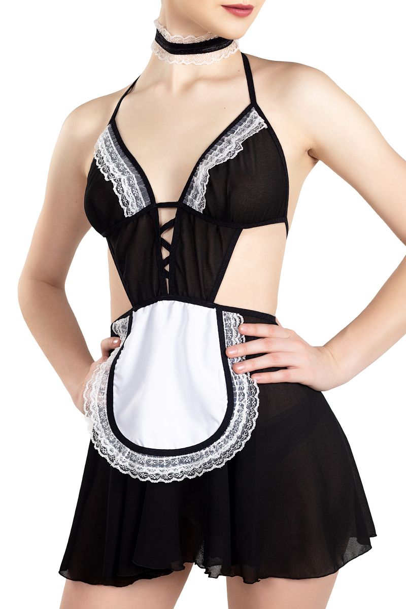 Костюм выполнен в классическом черно-белом сочетании, которое всегда выглядит стильно и эротично. Он состоит из короткого платья с расклешенной юбкой мини и кокетливого фартука.