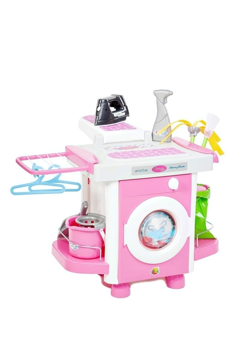 Игровой набор включает в себя реалистичную стиральную машину с нишей для загрузки, утюг, сушилку, гладильную доску, а также инвентарь для уборки — ведро, щетку, совочек и мешок для мусора. Верхняя часть модуля украшена гладильной доской и выносной гладильной доской, которые способствуют развитию координации движений. В комплекте есть бельевая веревка, прищепки и вешалки, что позволяет ребенку имитировать процесс стирки и сушильных работ как настоящая хозяйка.