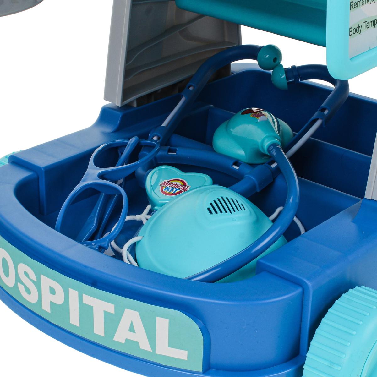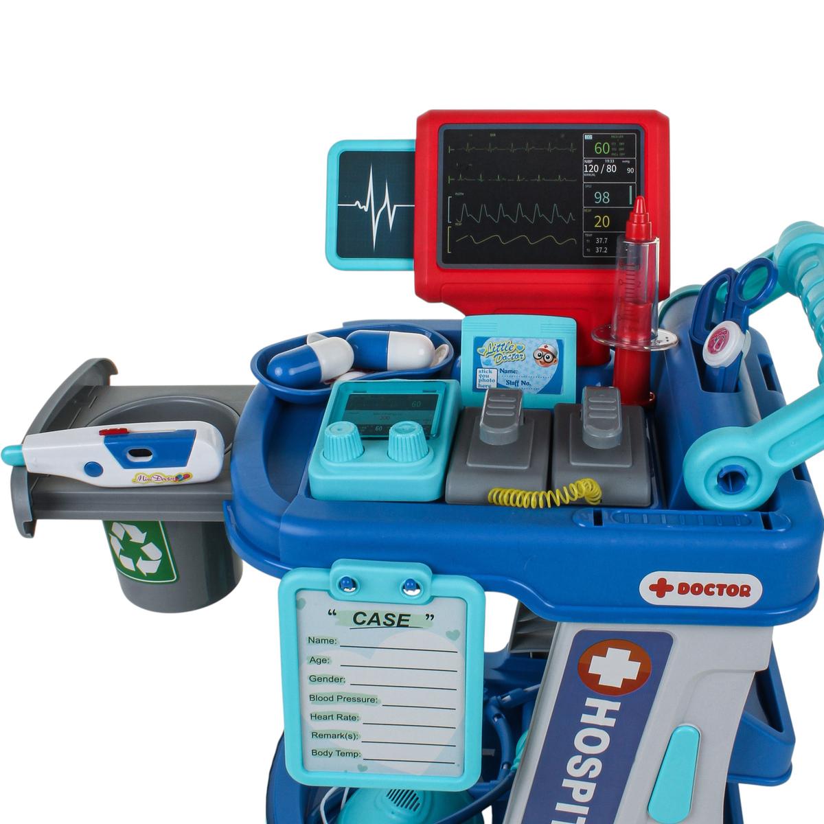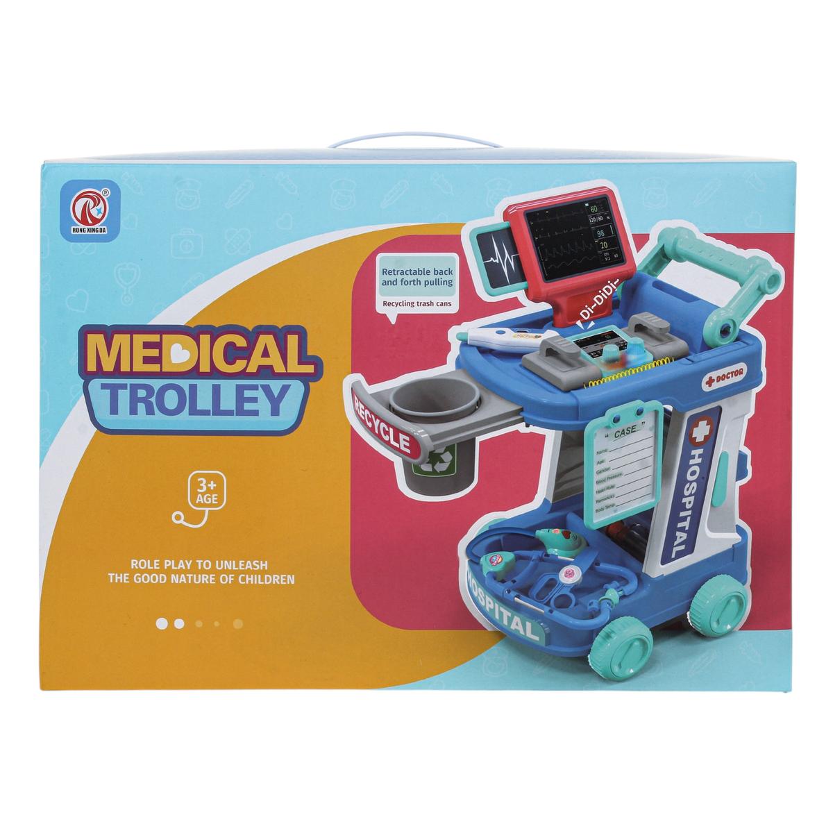 Модуль выполнен в виде удобной двухъярусной тележки с ручкой и колесами, которую можно легко перемещать по комнате. На верхней панели размещена имитация медицинского монитора, а в комплект входят необходимые инструменты для осмотра «пациентов»: