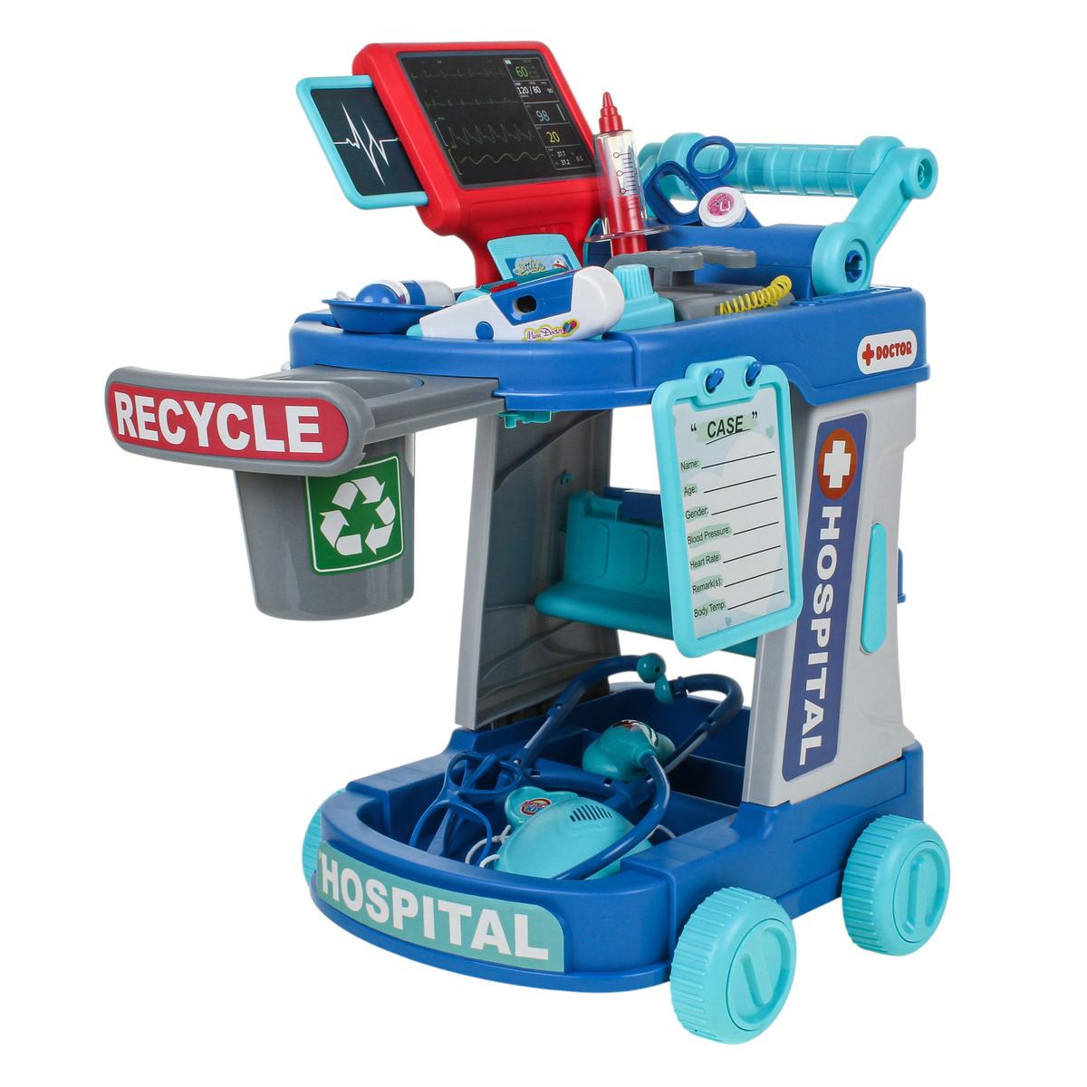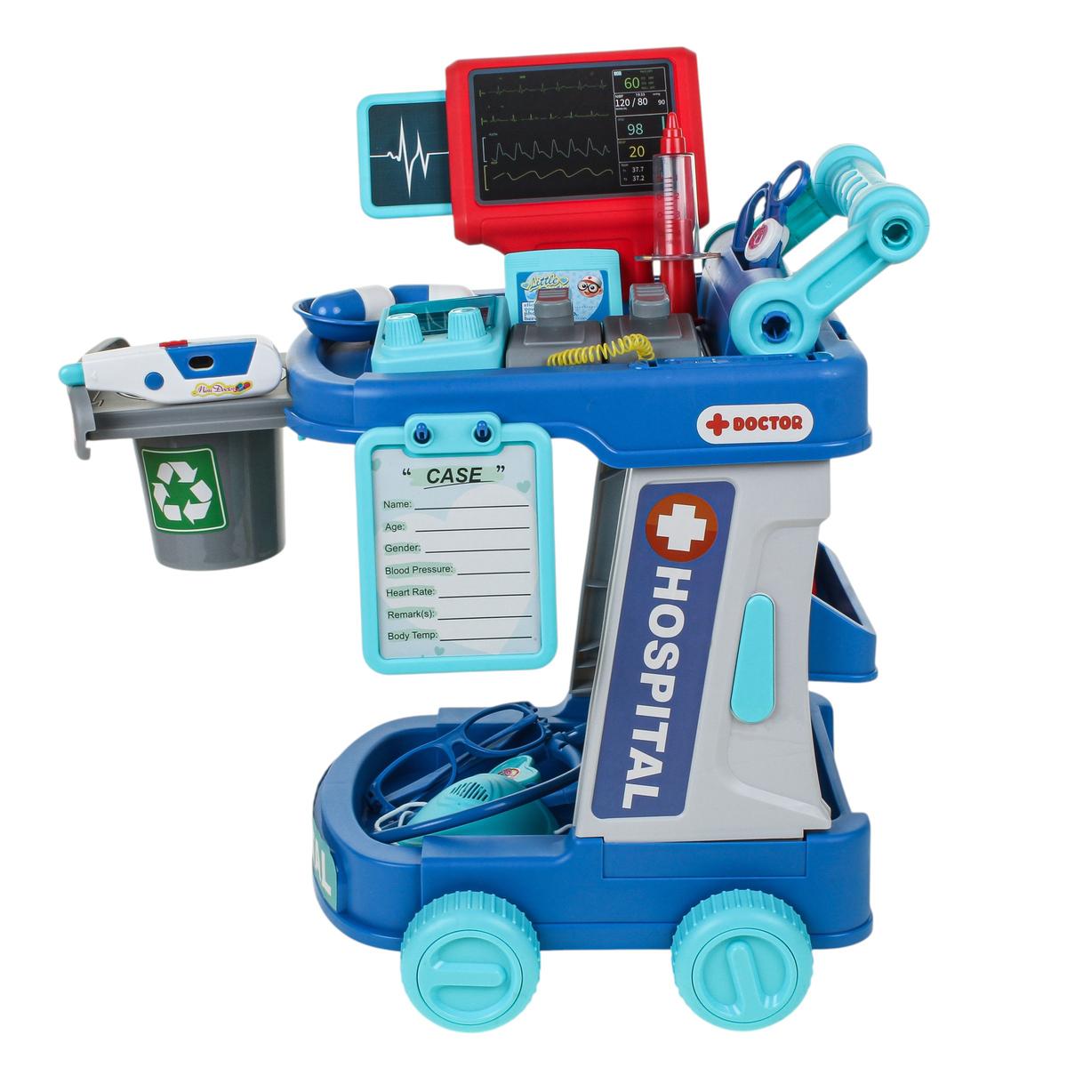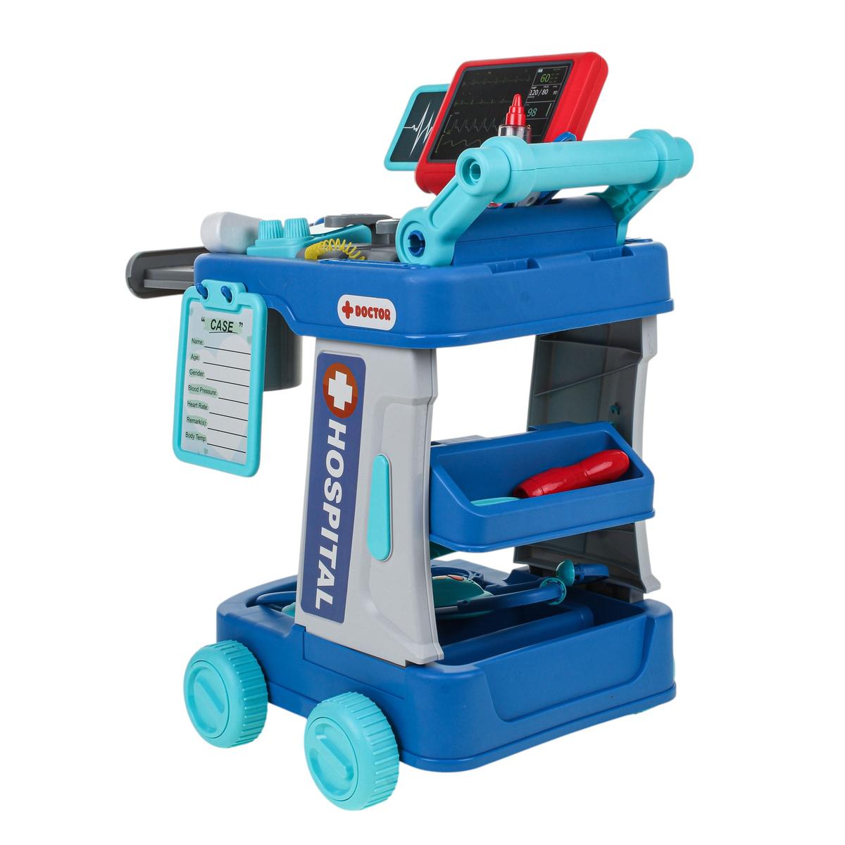 Модуль выполнен в виде удобной двухъярусной тележки с ручкой и колесами, которую можно легко перемещать по комнате. На верхней панели размещена имитация медицинского монитора, а в комплект входят необходимые инструменты для осмотра «пациентов»: