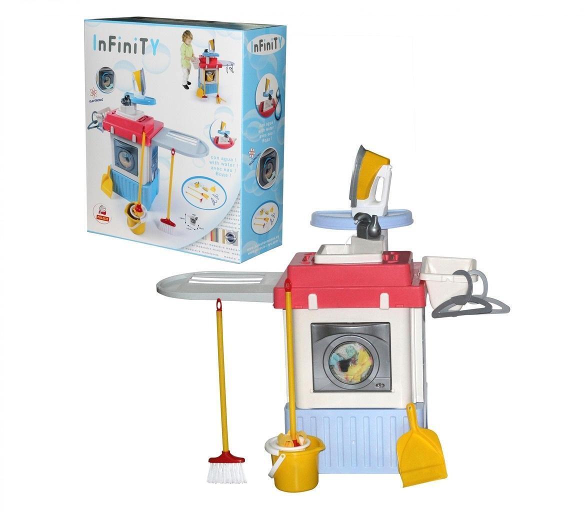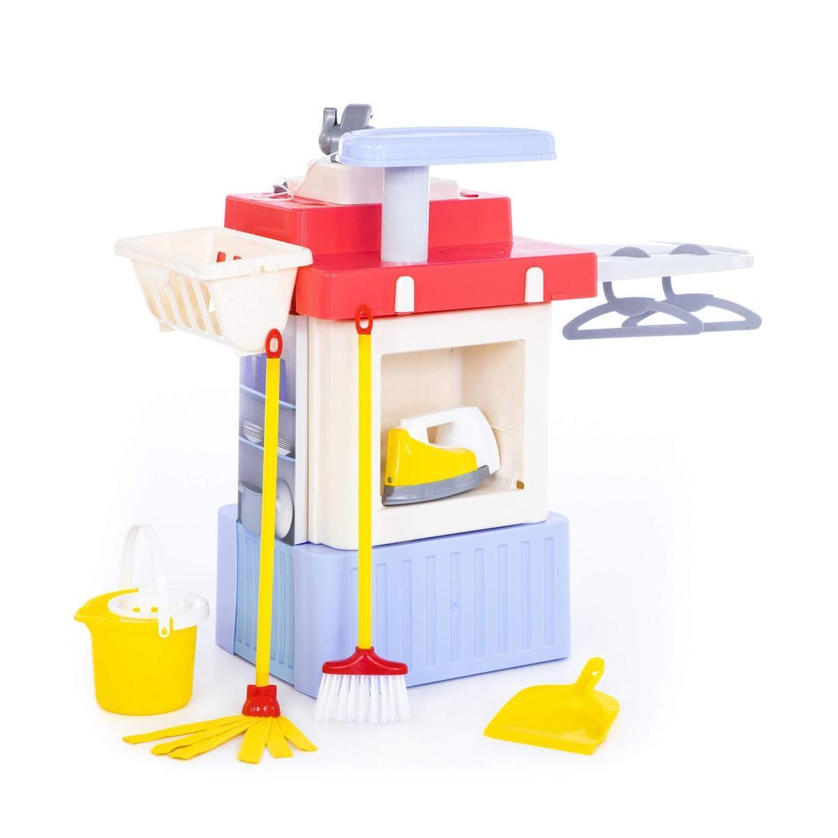 Игровой модуль включает в себя стиральную машину с вращающимся барабаном, который активируется нажатием кнопки. В набор входят гладильная доска, корзинка для белья, утюжок, вешалки (2 шт.), ведерко с отжимом, швабра, щетка и совок. Все элементы выполнены из безопасного пластика, что делает их идеальными для детей. Набор подходит для девочек от 3 лет и старше, позволяя им развивать воображение и творческие способности.