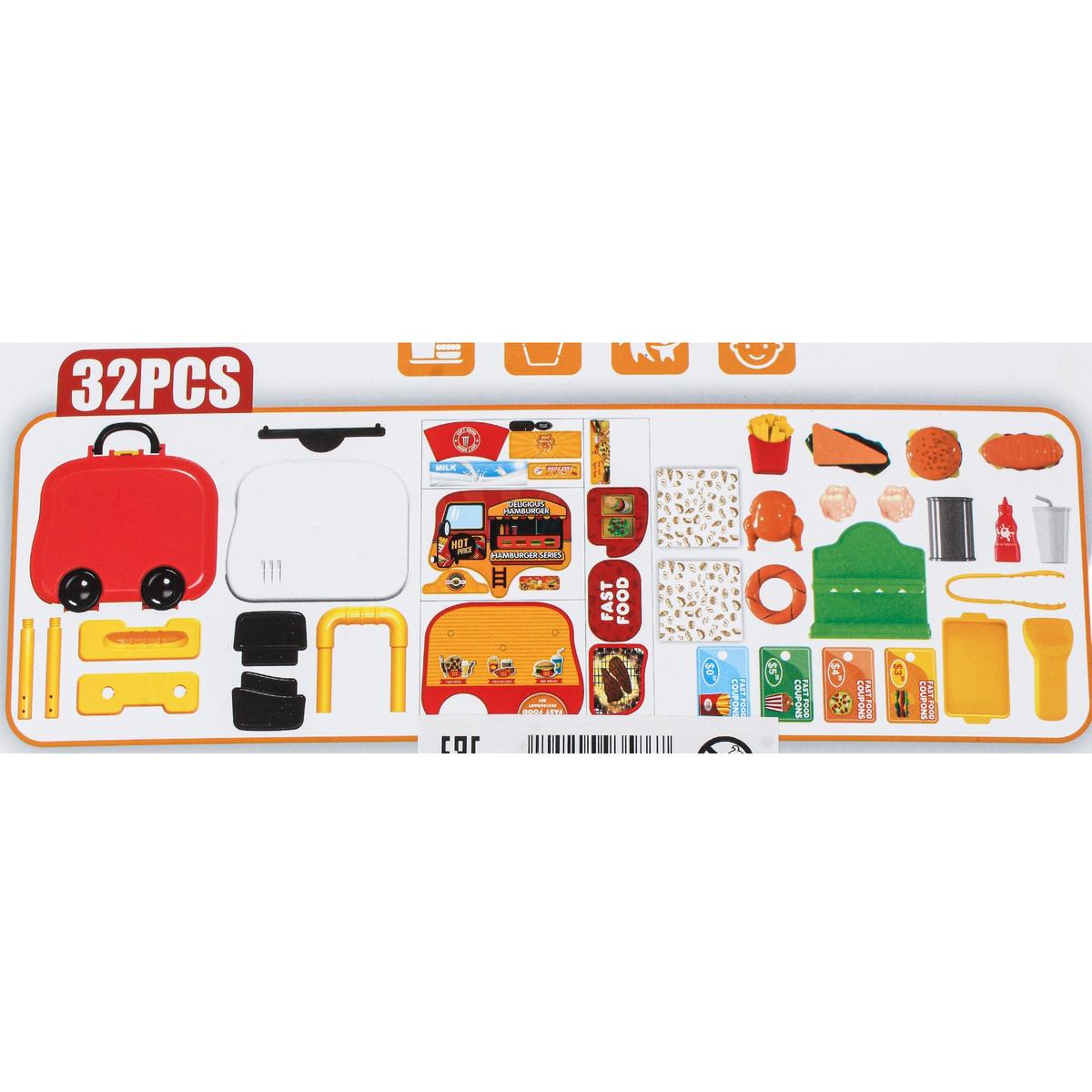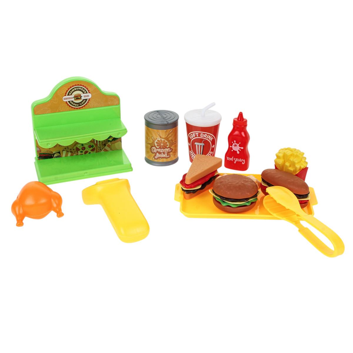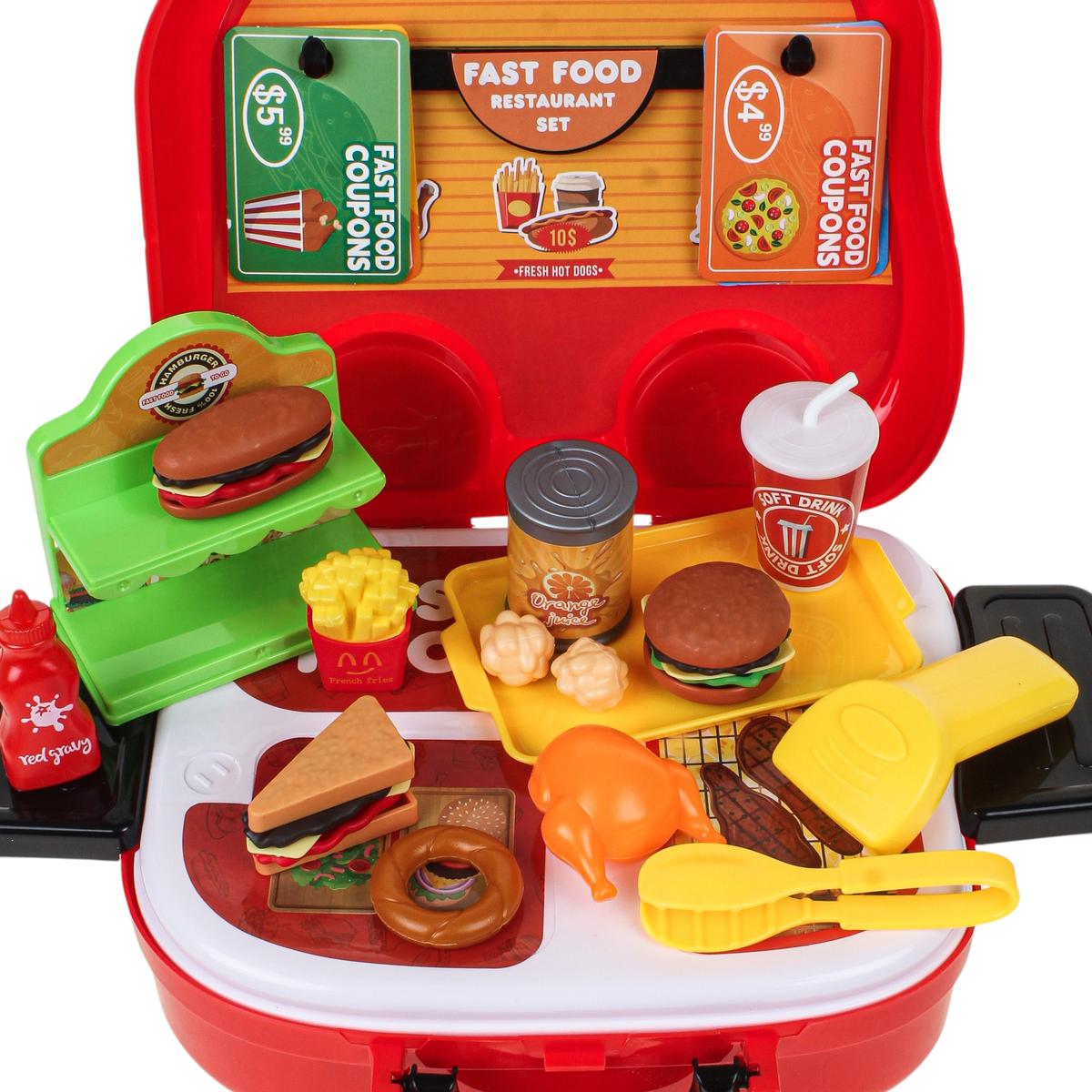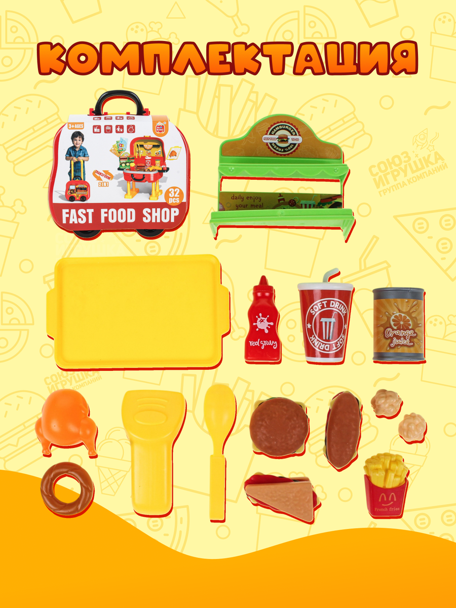 В набор входит 32 игровых элемента: муляжи фастфуда, стаканчик с напитком, картофель фри, гамбургер, поднос, цыпленок-гриль, кетчуп и другие аксессуары. Ребенок может разыгрывать сценки «ресторан», «кафе» или «фастфуд», развивая фантазию и коммуникативные навыки.