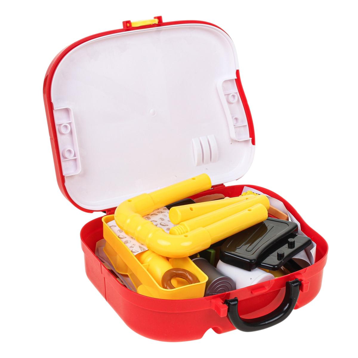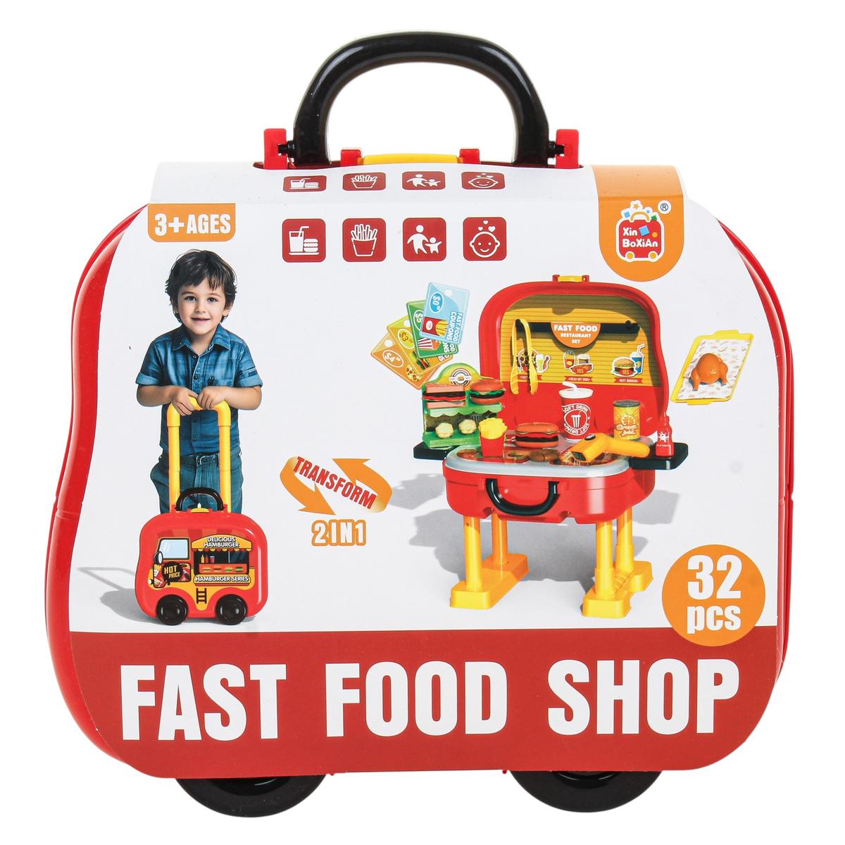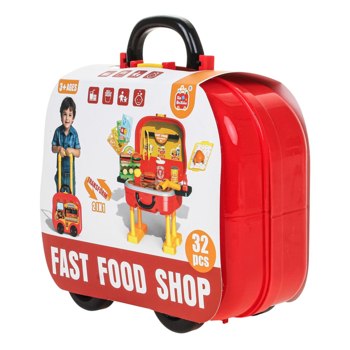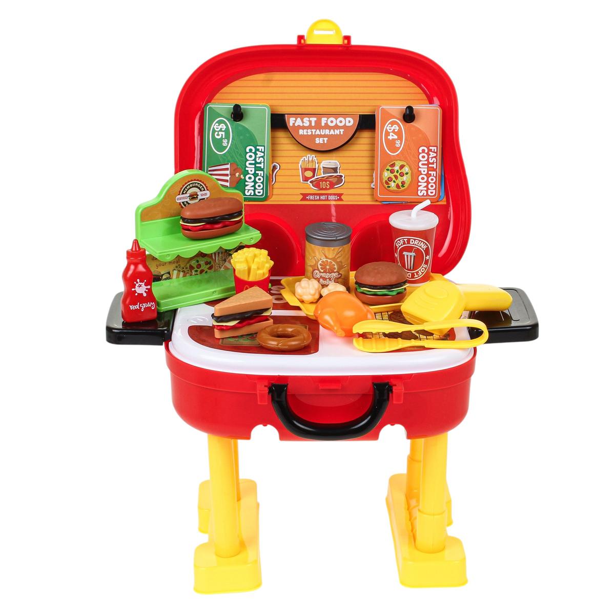 В набор входит 32 игровых элемента: муляжи фастфуда, стаканчик с напитком, картофель фри, гамбургер, поднос, цыпленок-гриль, кетчуп и другие аксессуары. Ребенок может разыгрывать сценки «ресторан», «кафе» или «фастфуд», развивая фантазию и коммуникативные навыки.