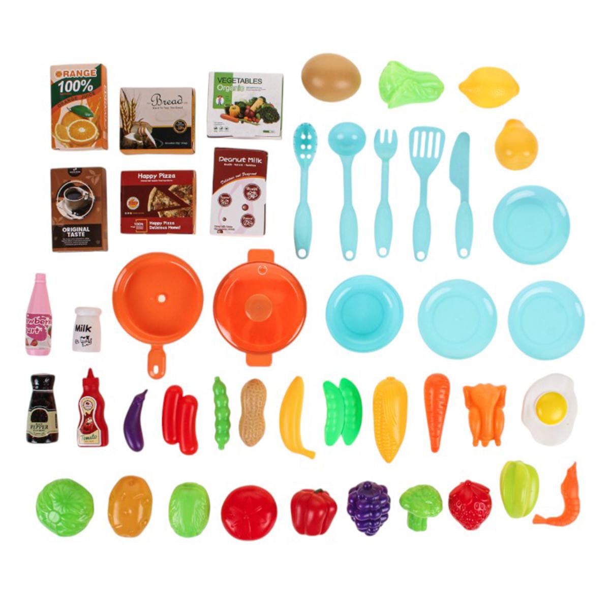 - Большое количество аксессуаров: кастрюли, сковороды, ложки, вилки, овощи, фрукты, упаковки продуктов.