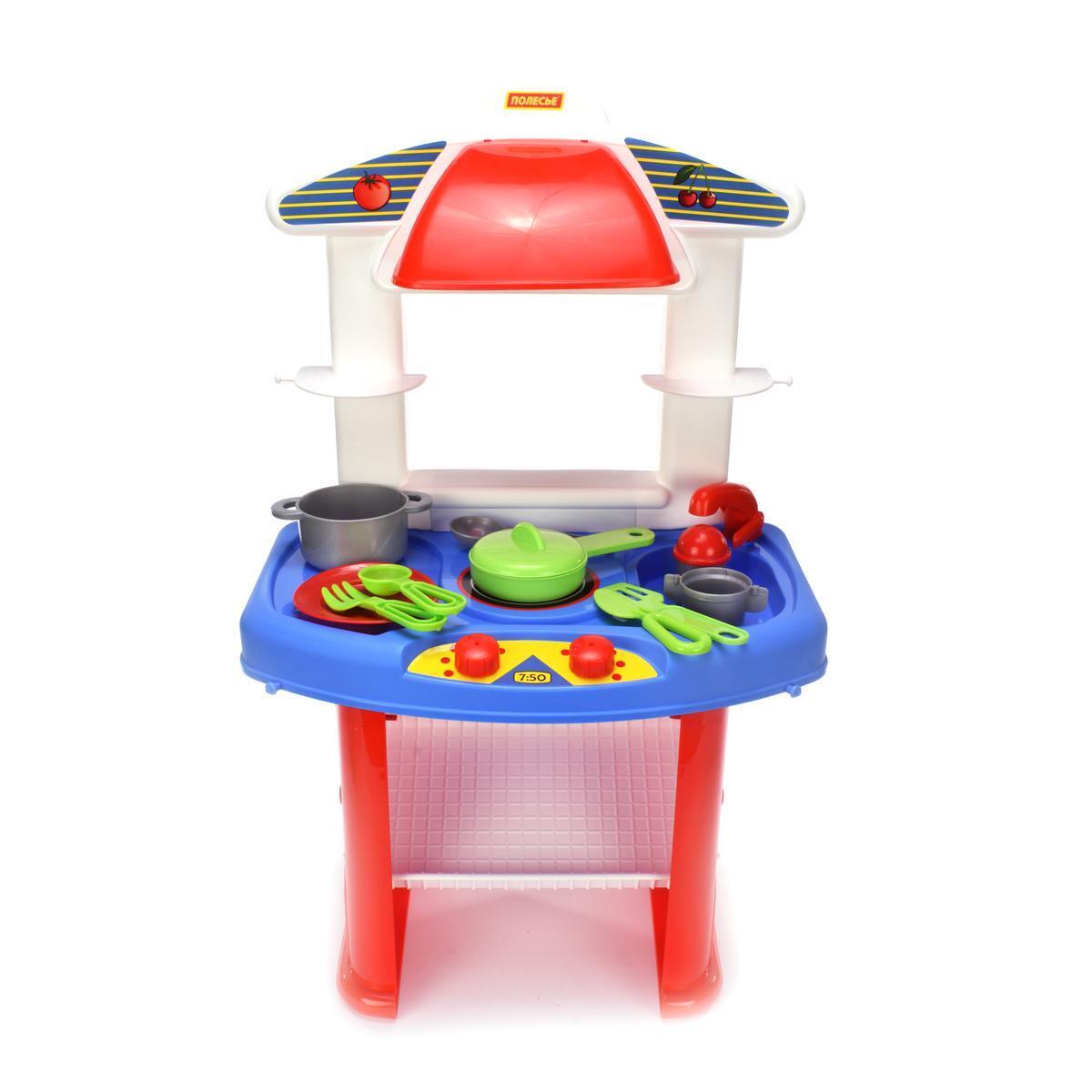 Кухня изготовлена из прочного пластика с закруглёнными краями, что обеспечивает безопасность во время игры. Яркая комбинация синего, красного и зелёного цветов стимулирует визуальное восприятие, а компактные габариты позволяют разместить модуль даже в небольшой комнате.