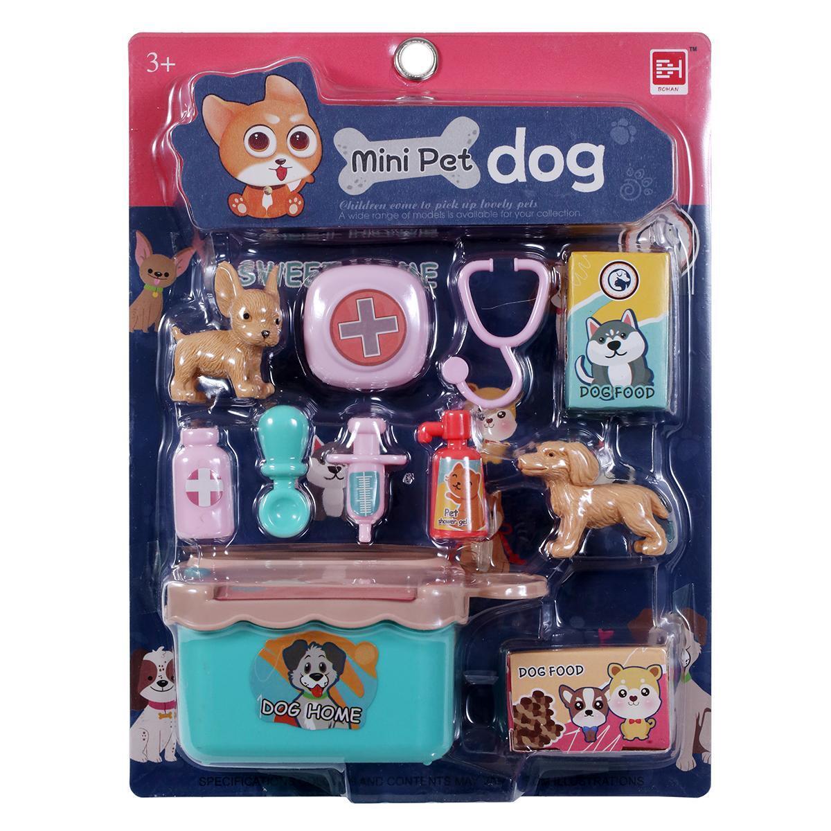 В набор входят: модель собаки (корги), игрушечная аптечка с красным крестом, фонендоскоп, бутылочка с лекарством, шприц и контейнер для пищи с надписью "DOG FOOD". Все элементы выполнены в ярких цветах, что делает их привлекательными для детей. Упаковка из прозрачного пластика позволяет видеть содержимое, что добавляет интереса к игре.