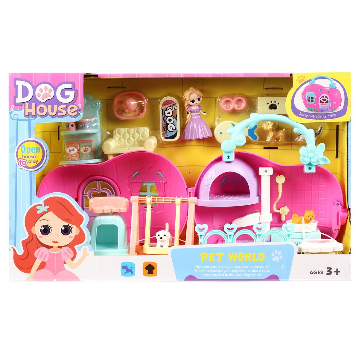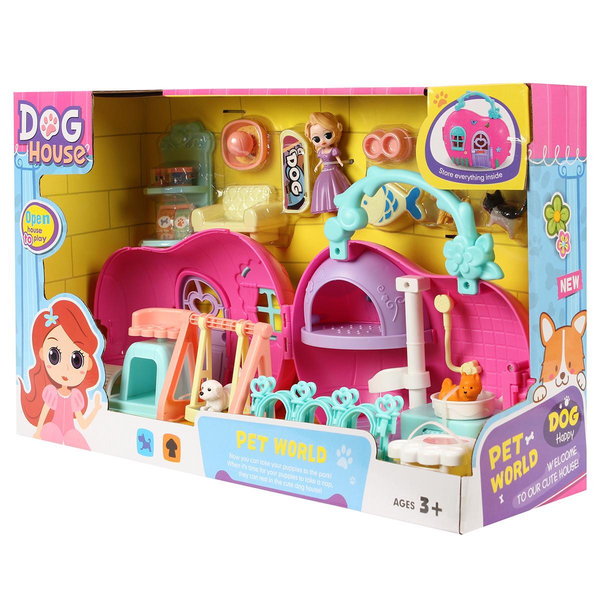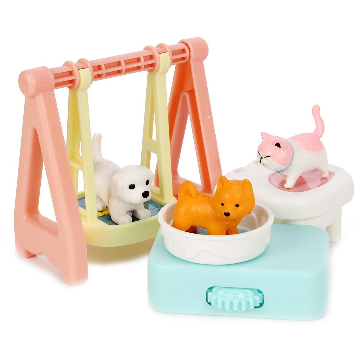 Набор включает в себя домик, выполненный в розовом цвете с голубыми элементами, а также фигурки животных: собаку и кошку. Внутри домика расположены предметы мебели, такие как желтый диван и полки с игрушечными консервами, что позволяет создавать различные игровые сценарии. Игровая площадка с качелями добавляет разнообразия в игру, позволяя детям развивать социальные навыки и взаимодействовать с друзьями.