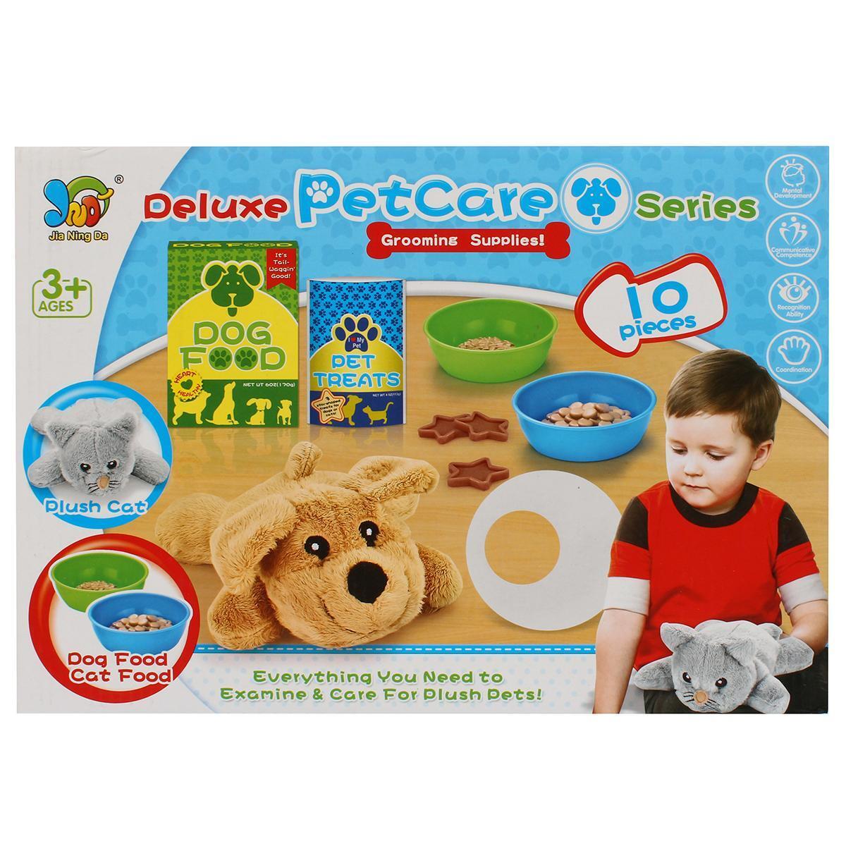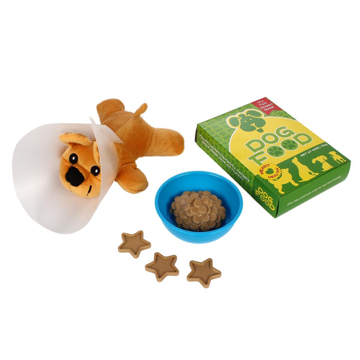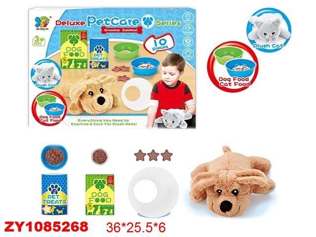Комплект включает 10 элементов: мягкие игрушки собак и кошек, пластиковые миски в зеленом и синем цветах, упаковки с имитацией корма «Dog Food» и «Pet Treats», а также игровые аксессуары в виде кормушек и колец. Все детали выполнены из безопасных и мягких материалов, приятных на ощупь и устойчивых к активным играм.