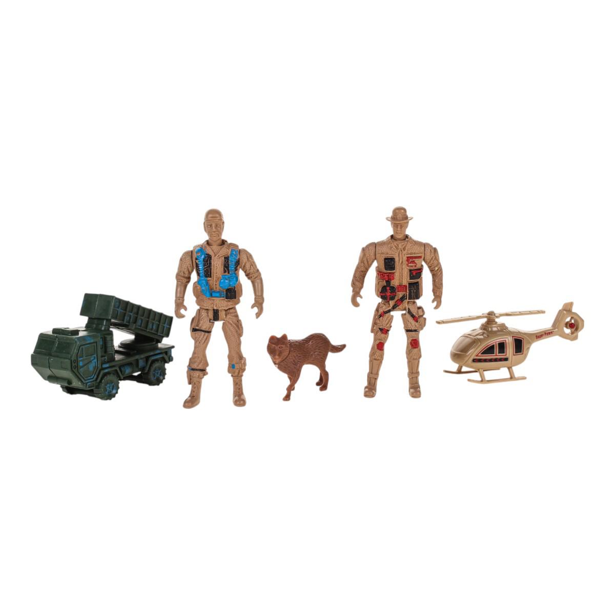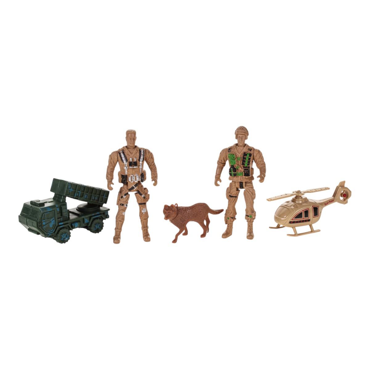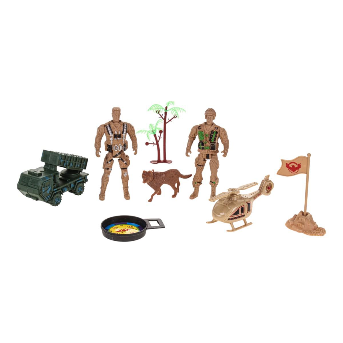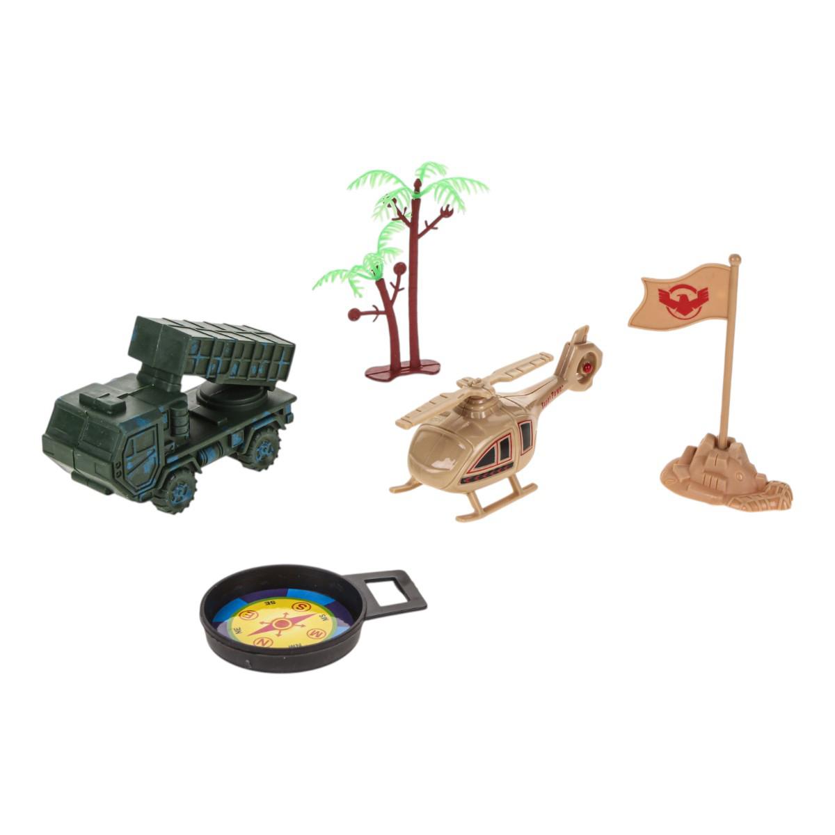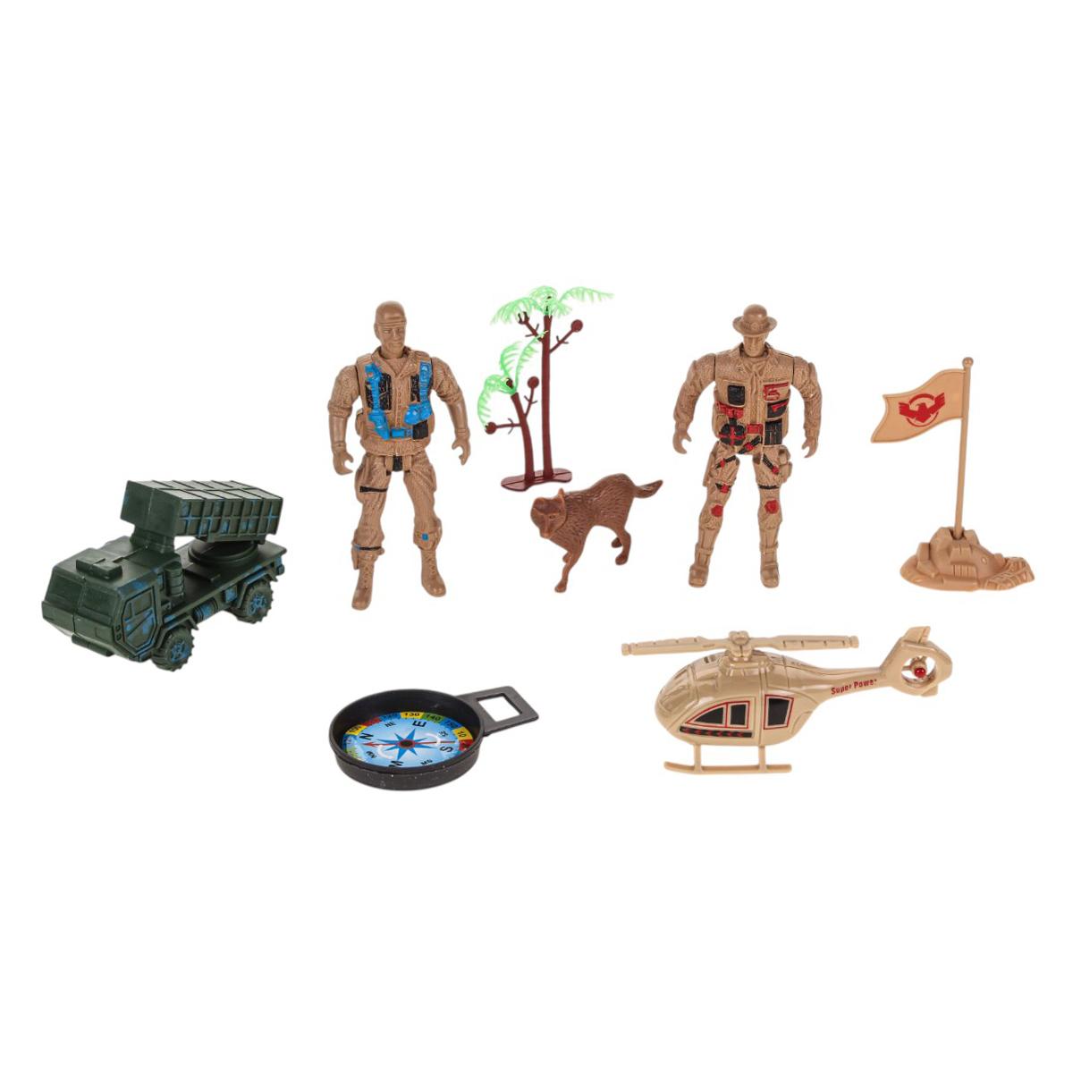 Этот игровой набор отлично подходит для мальчиков, увлекающихся военной тематикой и приключениями. В комплект входят фигурки солдат, вертолет, танк, собака, флаг, бревна и компас – всё, что нужно для создания захватывающих сюжетов и развития воображения.