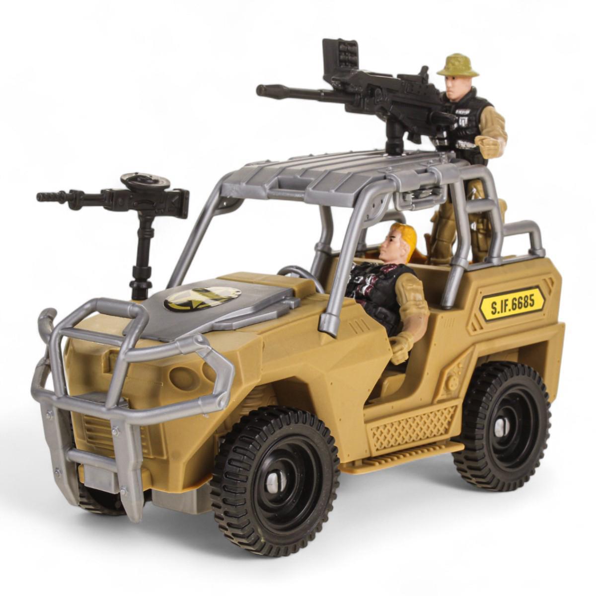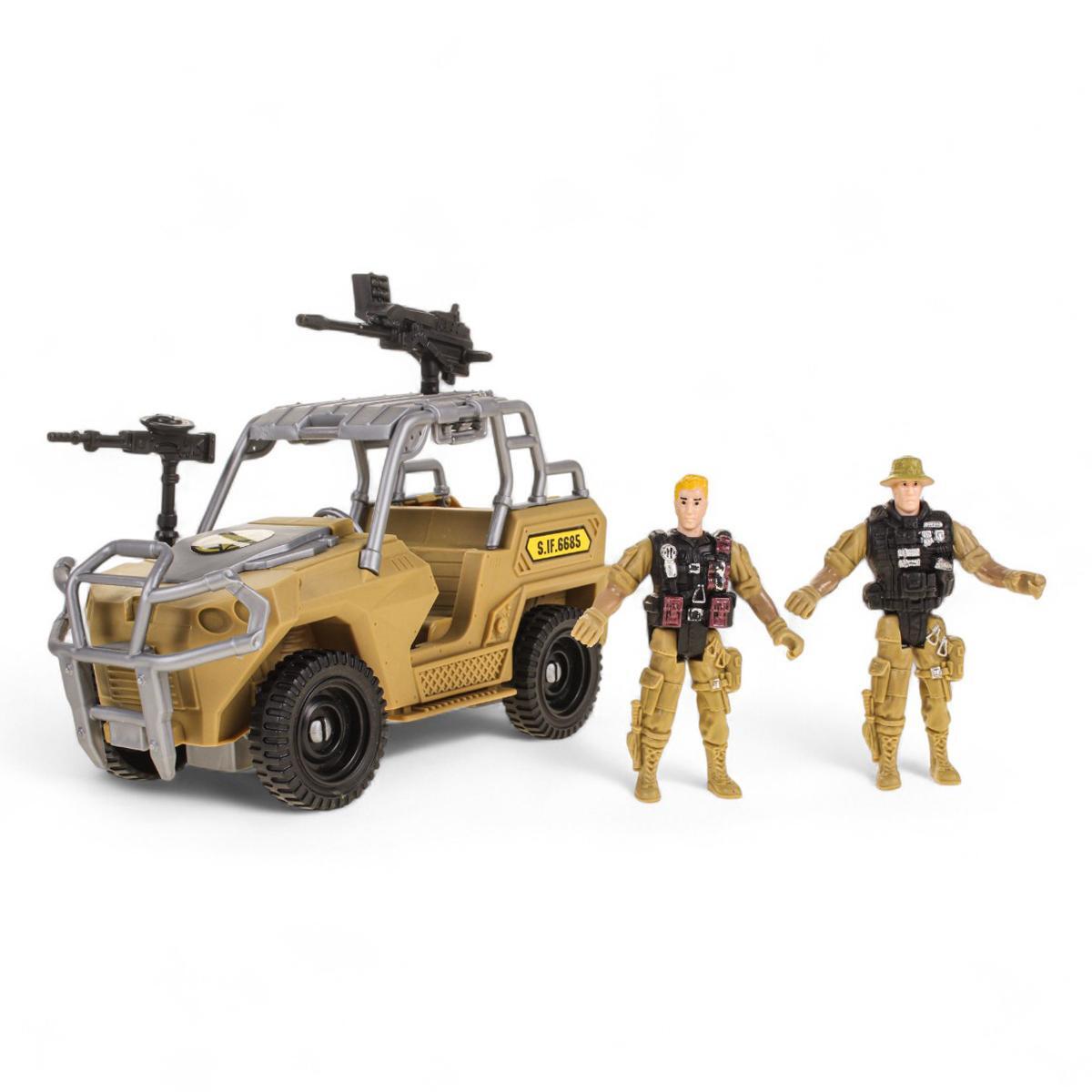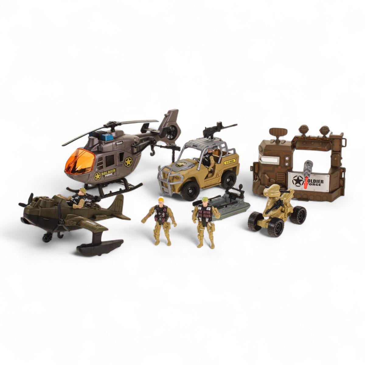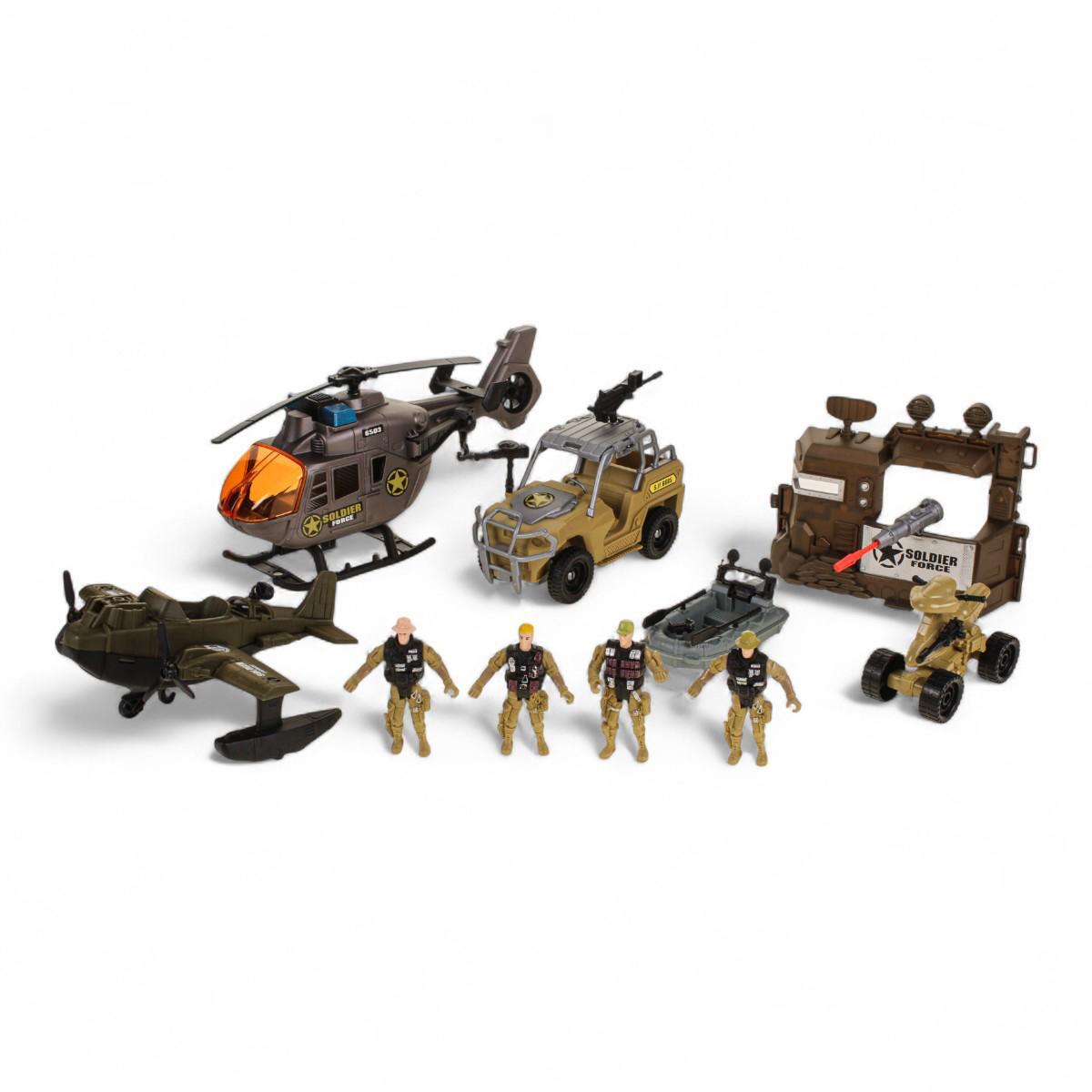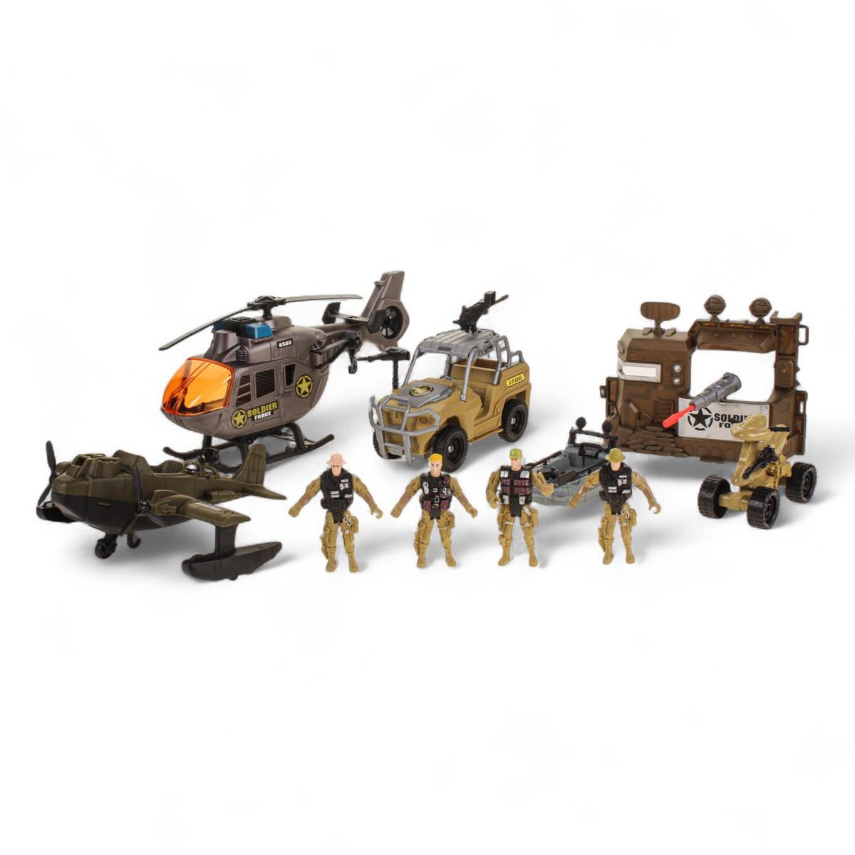 Подарите ребенку возможность создавать свои собственные сюжеты и развивать воображение. Этот набор включает все необходимое для увлекательной игры: 2 фигурки солдат, квадроцикл, машину, вертолет и лодку.