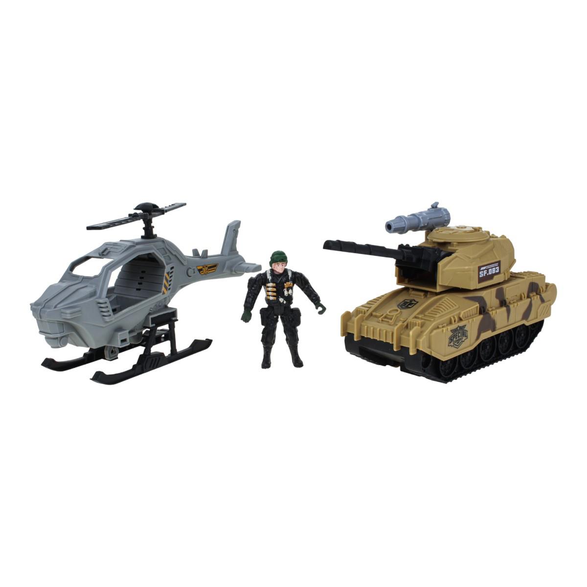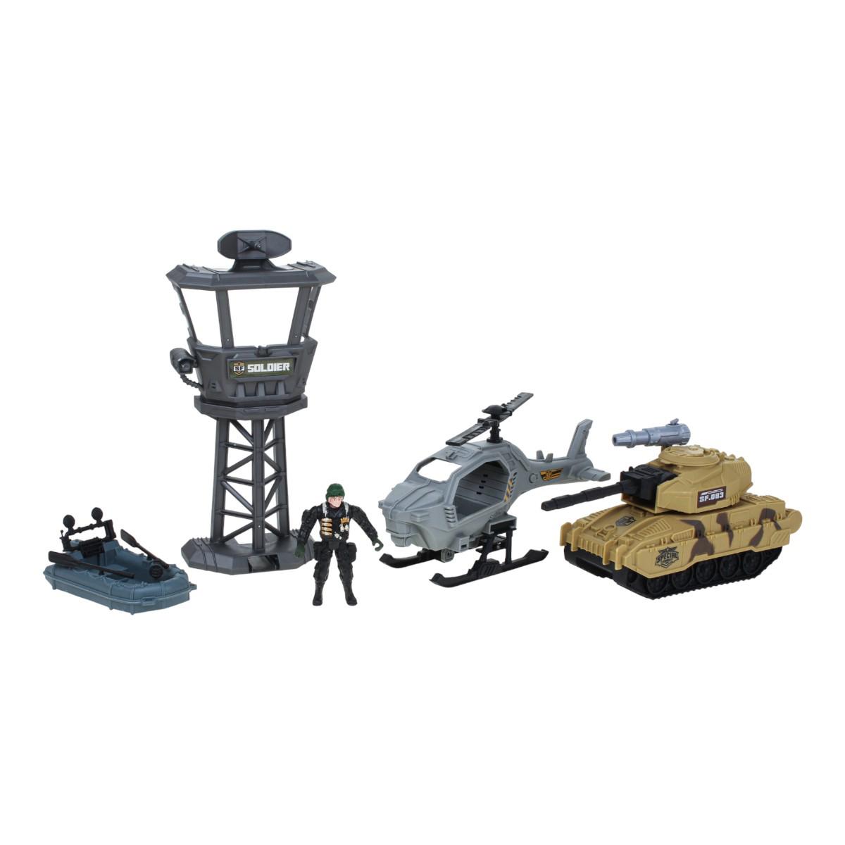 Только для детей от 3 лет. В набор входят фигурка солдата, вертолет, танк, лодка и наблюдательная вышка – все детали позволяют создавать целые сюжетные линии.