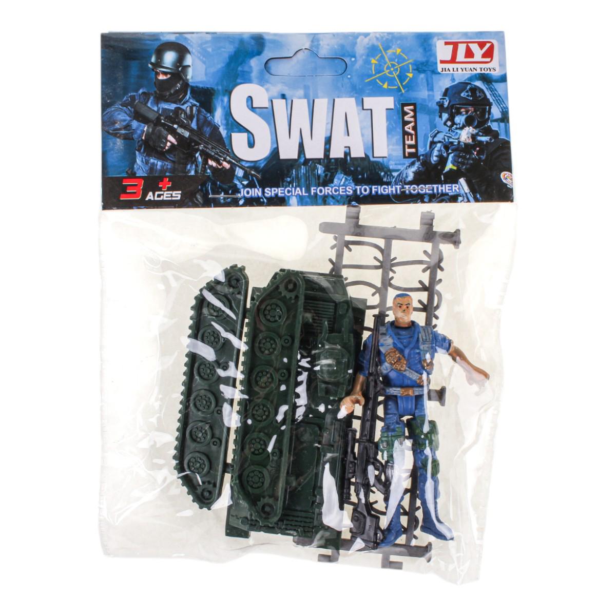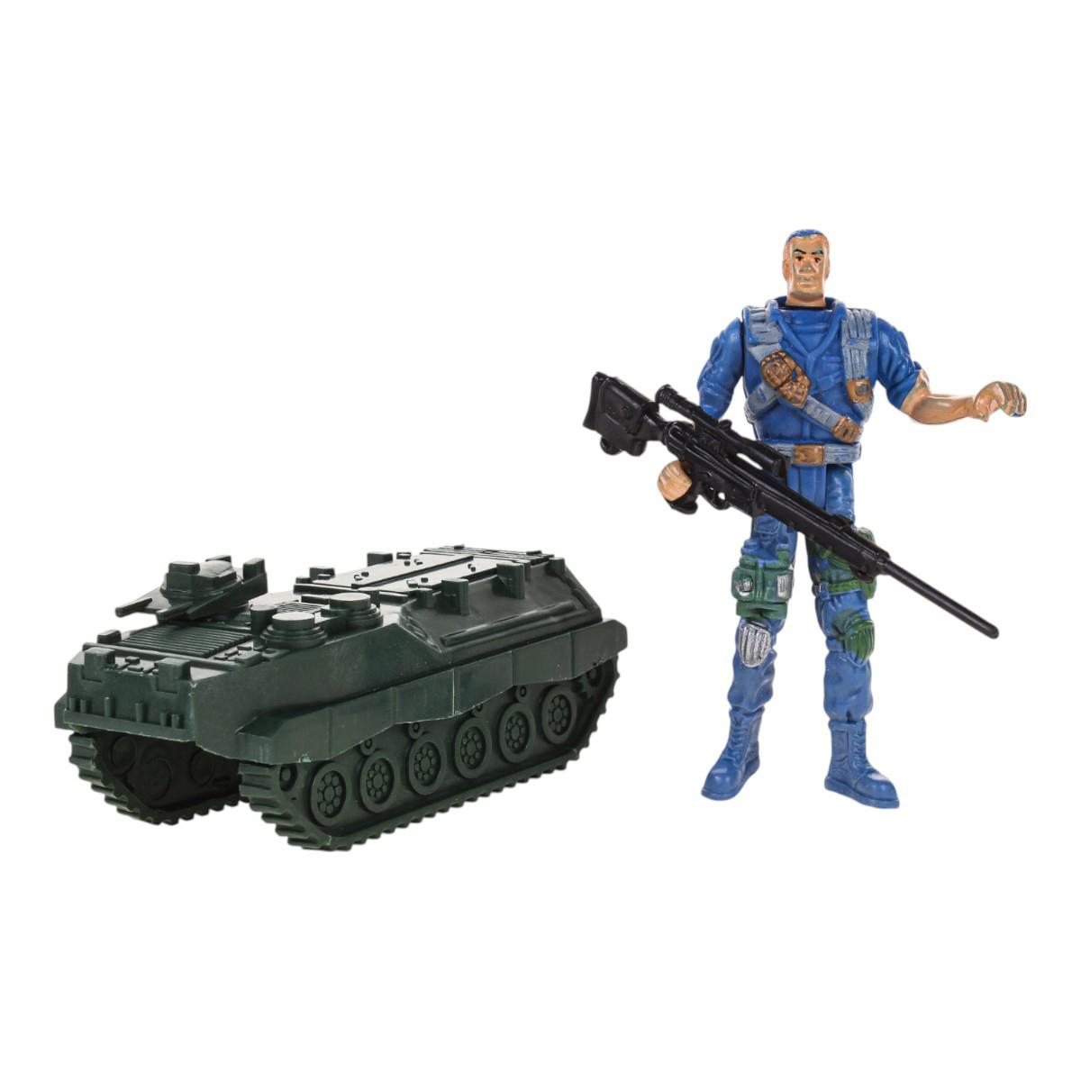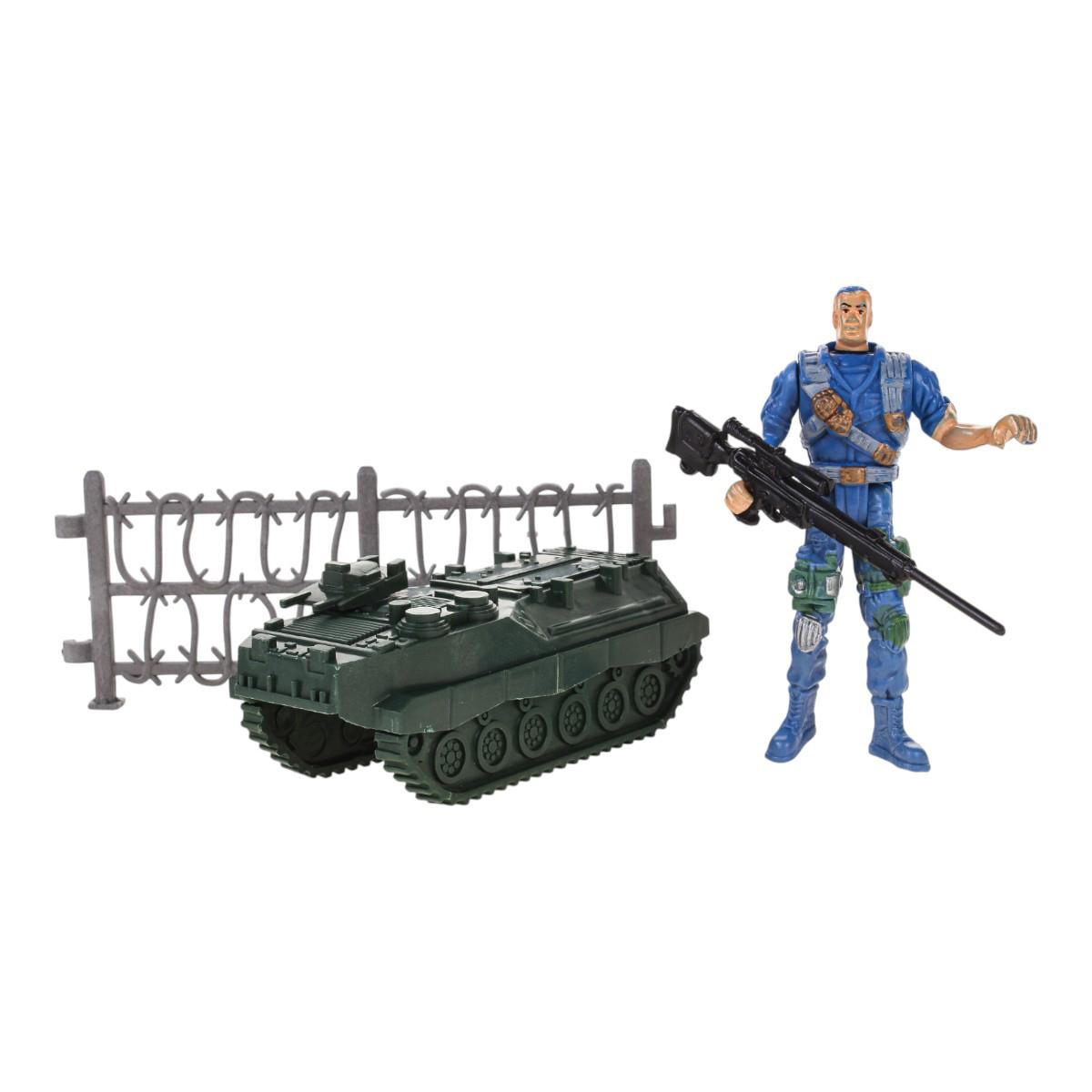 Игровой набор включает в себя фигурку солдата, танк, ограждение и оружие, что позволяет создавать различные игровые ситуации. Набор подходит для детей от 3 лет и старше, обеспечивая безопасные и увлекательные часы игры. Все элементы выполнены из качественного пластика, что гарантирует долговечность и надежность в использовании.