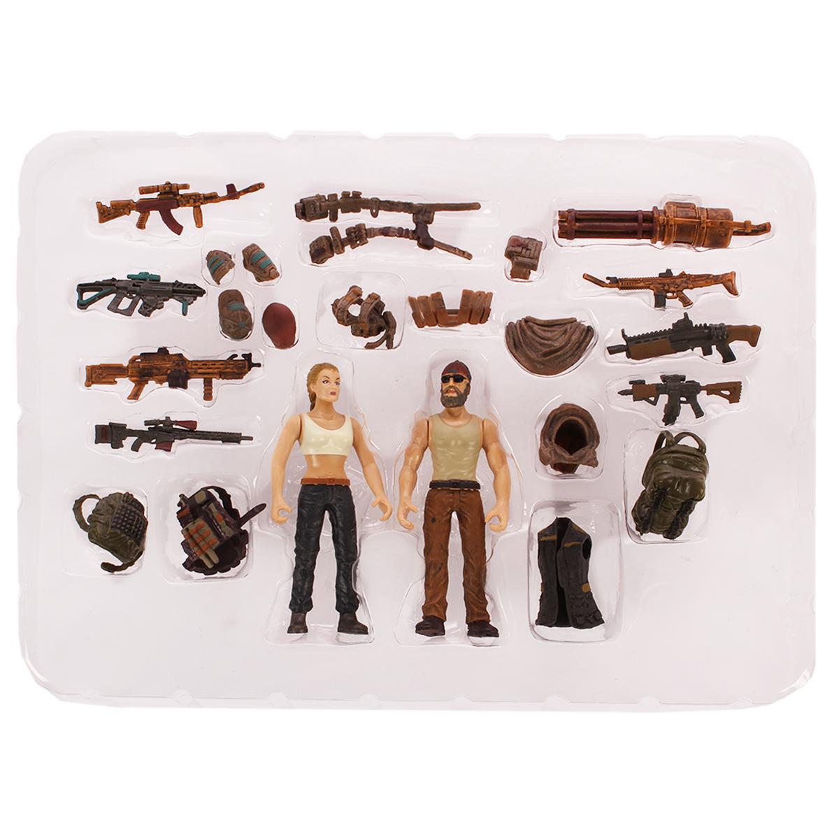 В комплект входят две фигурки: мужчина и женщина, каждая из которых имеет уникальные детали и аксессуары. Фигурки одеты в стильную военную экипировку и готовы к любым приключениям. Набор также включает разнообразное игрушечное оружие, такое как автоматы и гранаты, а также рюкзаки и бронежилеты, что делает игру еще более увлекательной.