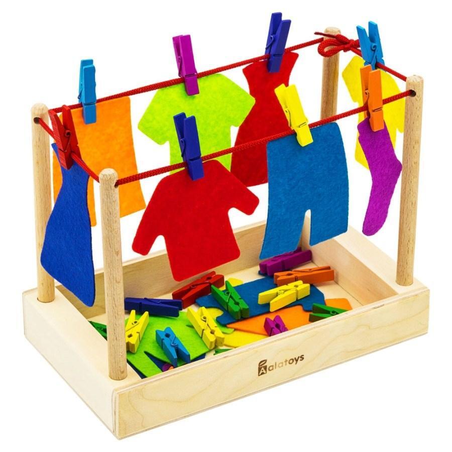 Игровой набор идеально подходит для детей, которые любят ролевые игры. Он включает в себя деревянную сушилку с четырьмя стойками и шнуром, на который можно развешивать разноцветные фетровые вещи. В комплекте также 24 пластиковые прищепки, которые помогут закрепить одежду на сушилке. Дети могут использовать детали заданного цвета или формы, что делает игру еще более увлекательной и познавательной.