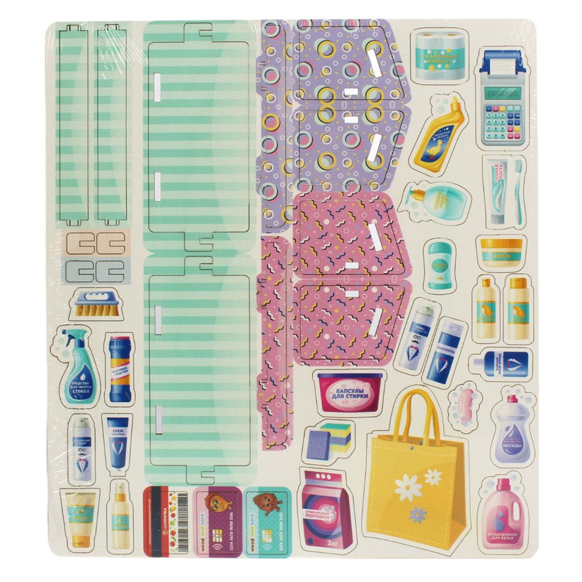 В набор входят два стеллажа для товаров, выполненные из картона, а также миниатюрные пластиковые предметы, такие как бутылка чистящего средства и упаковка порошка. Размеры упаковки составляют 300 мм на 150 мм, что делает его удобным для хранения и транспортировки. Яркий и привлекательный дизайн набора привлечет внимание вашего ребенка и сделает игру еще более интересной.