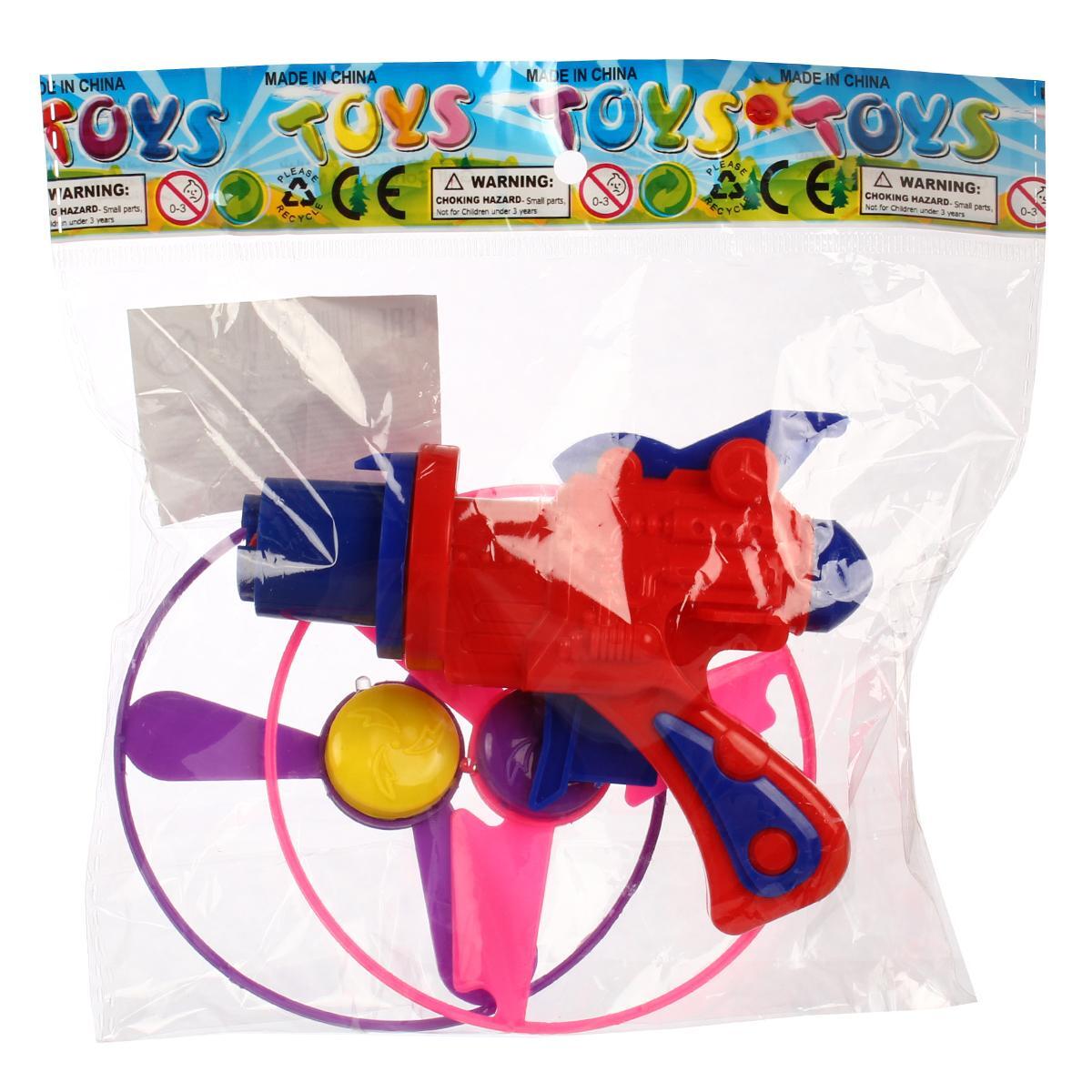 Подходит для детей старше 3 лет. В набор входит пистолет и 2 кольца с пропеллерами.