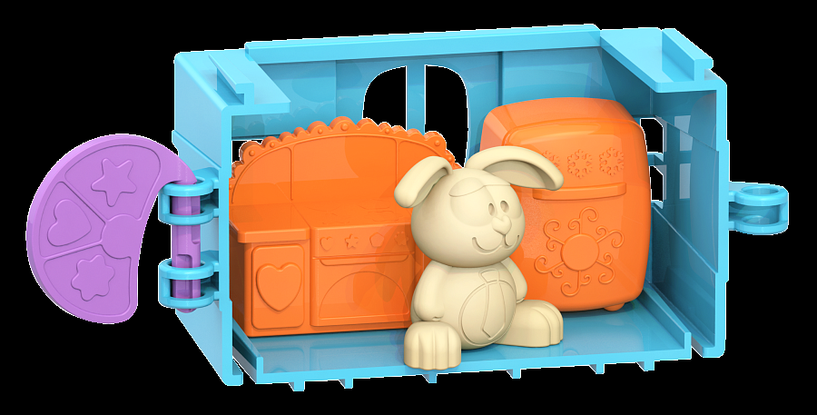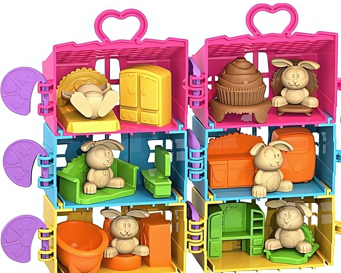 Этот набор представляет собой яркий и многофункциональный домик с 6 комнатами: кухня, спальня, гостиная, гардеробная, столовая и ванная. Каждая комната укомплектована мебелью, аксессуарами и фигурками зайцев, что позволяет создавать разнообразные игровые сценарии и развивать фантазию детей.