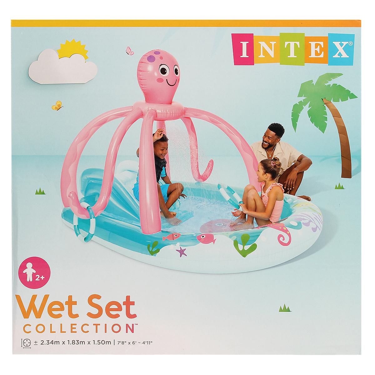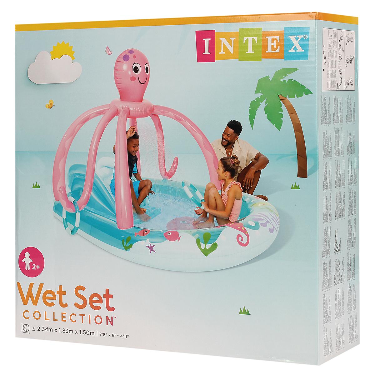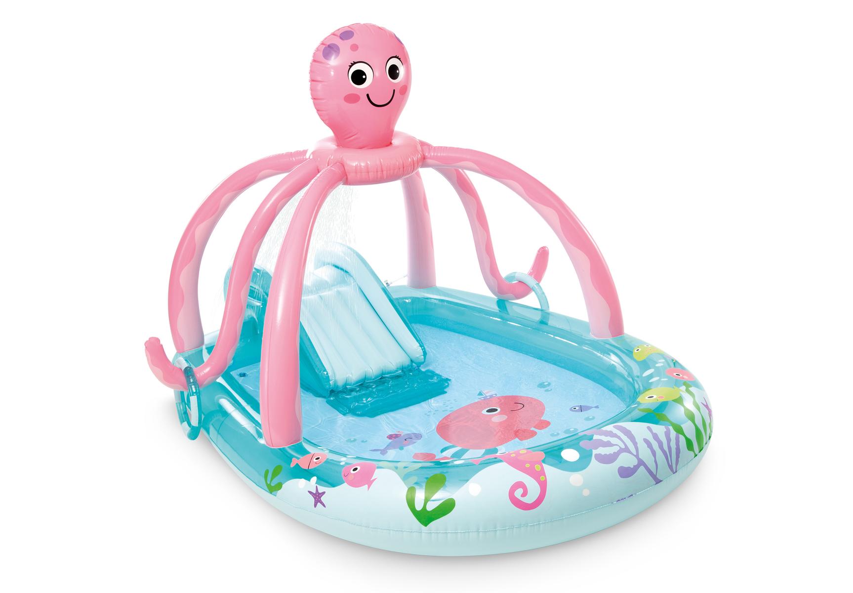 Игровой центр предназначен для детей от 2 лет и идеально подходит для использования на открытом воздухе. Он включает в себя водную горку и разбрызгиватель, который работает от садового шланга, что добавляет элемент веселья и интерактивности. Бассейн легко надувается и сдувается, что делает его удобным для хранения и транспортировки.