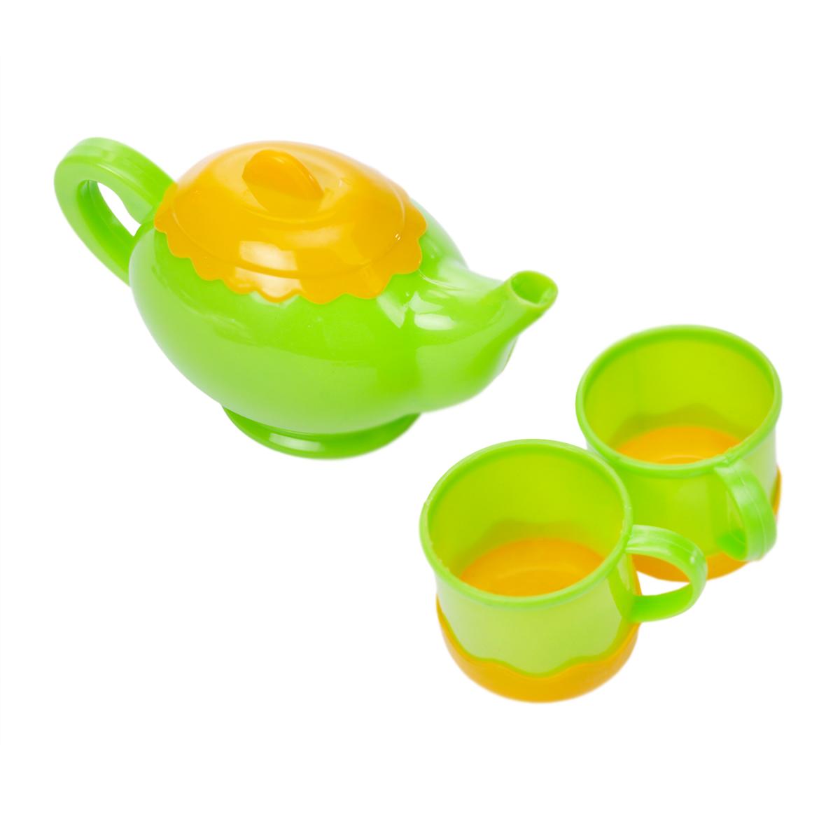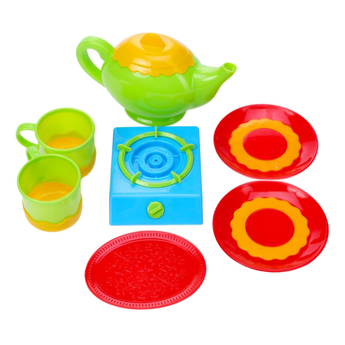 Набор включает: чайник, кружки, тарелки и плиту — всё выполнено из высококачественного, прочного и безопасного пластика, что обеспечивает длительный срок использования и безопасность для здоровья ребёнка.
