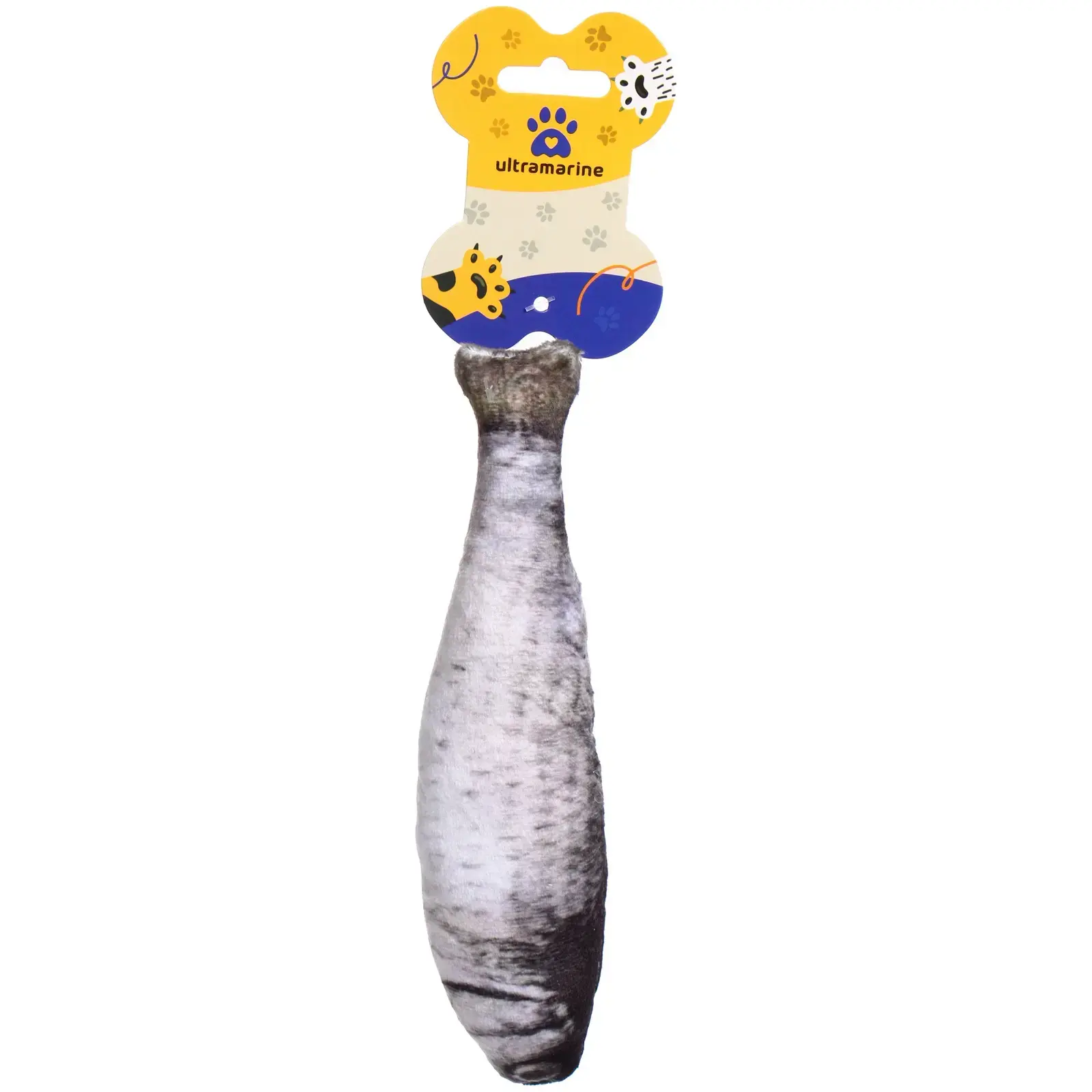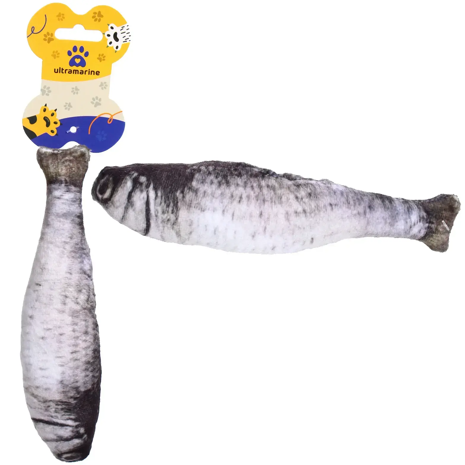 Серо-белый окрас с контрастными полосами максимально приближен к естественной расцветке рыбы. Мягкий текстиль приятен для зубов и когтей, сохраняя форму после многочисленных атак. Компактный размер 20 см идеально подходит для переноски в зубах.