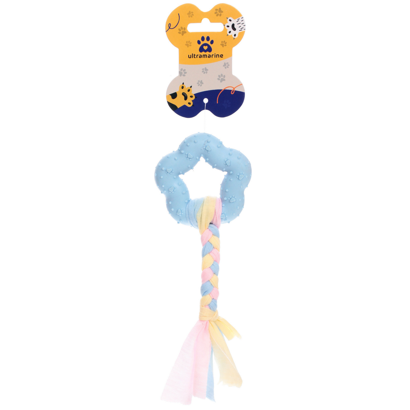 Игрушка имеет уникальную форму звезды с рельефной поверхностью, что делает её удобной для захвата. Плетеная часть игрушки состоит из трех цветов: розового, желтого и голубого, что добавляет яркости и разнообразия. Упаковка выполнена в ярких цветах и оформлена с изображениями собак, что делает её отличным подарком для любителей животных.