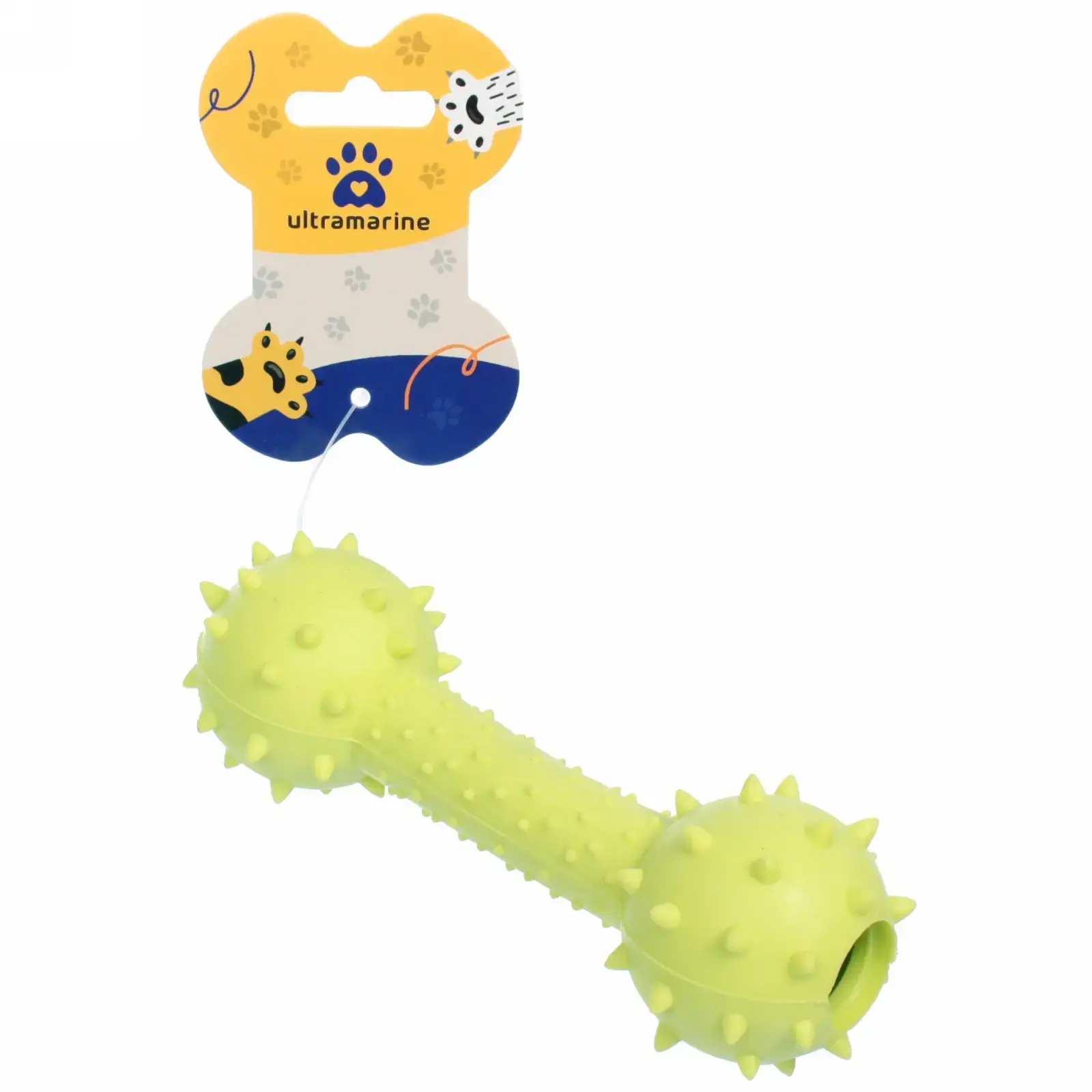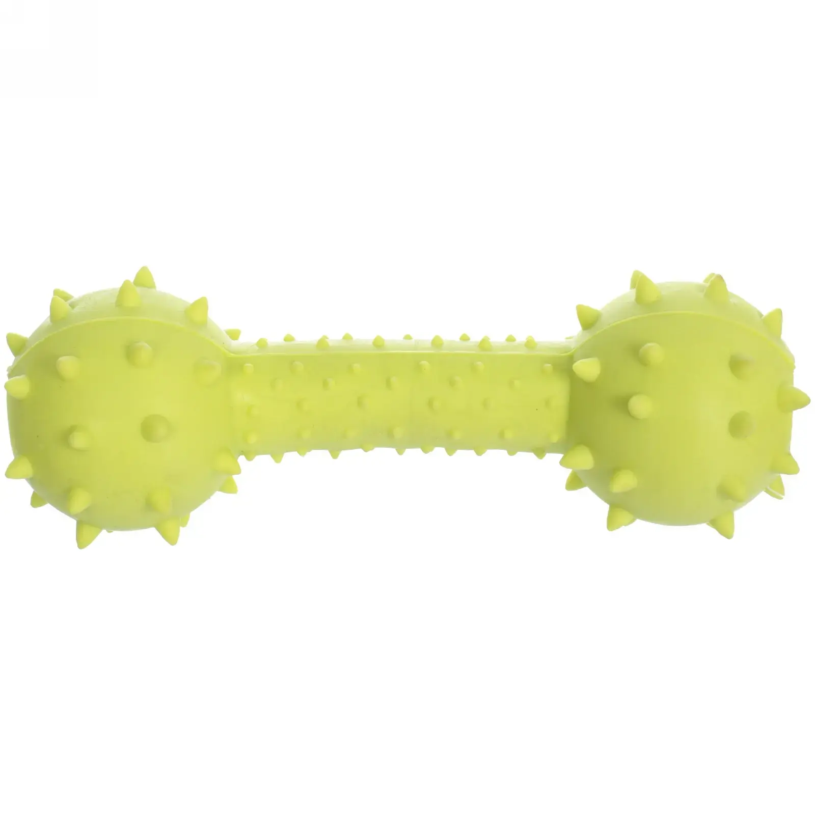 Размер игрушки составляет 14 см, что делает её удобной для захвата и игры. Яркий зеленый цвет и оригинальная форма в виде гантели с шипами по бокам добавляют привлекательности и функциональности. Игрушка подходит для всех пород собак и станет отличным подарком для вашего четвероногого друга.