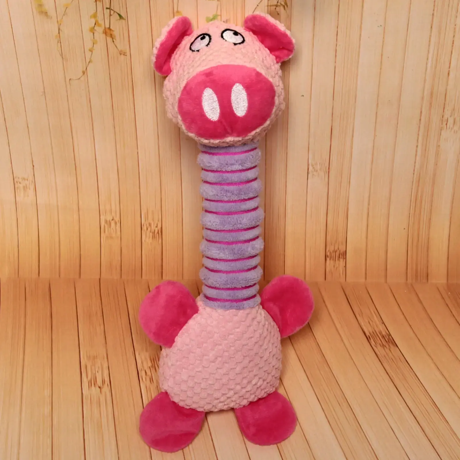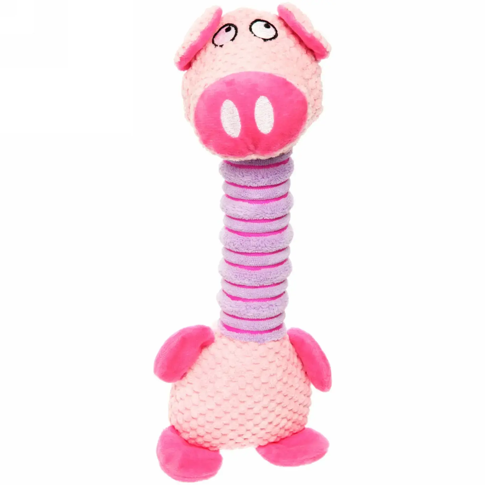 Размер игрушки составляет 34 см, что делает её удобной для захвата и игры. Основной цвет — розовый с фиолетовыми элементами, что добавляет яркости и привлекательности. Игрушка имеет рифлёную текстуру на шее, что усиливает тактильные ощущения при игре. Она станет отличным подарком для вашего питомца и поможет укрепить вашу связь.