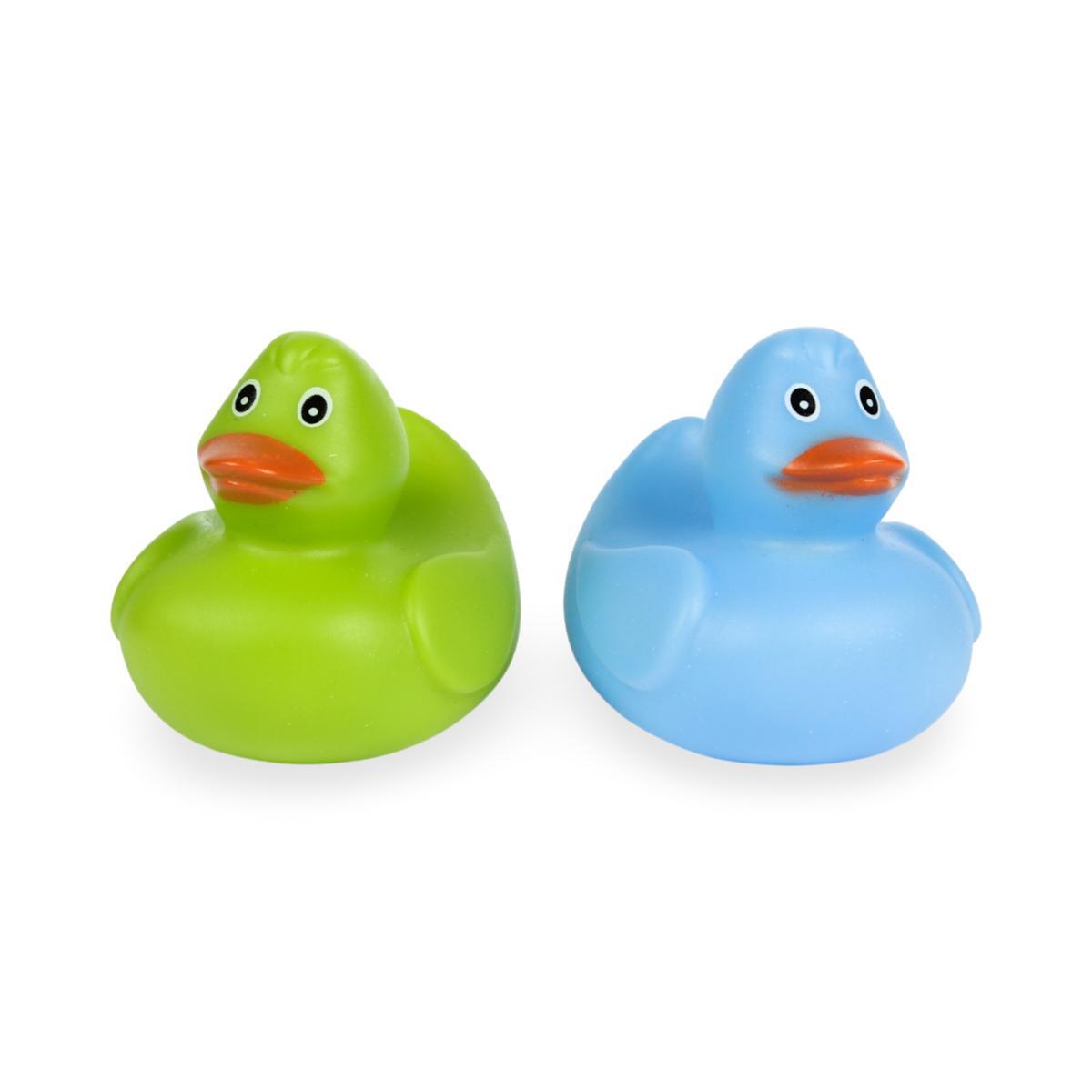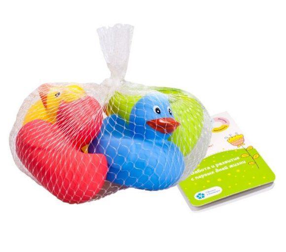 Набор включает 4 уточки разных цветов (желтый, зеленый, красный, голубой). Размер каждой игрушки около 10 см. Упакованы в удобную сетку с информационной биркой.