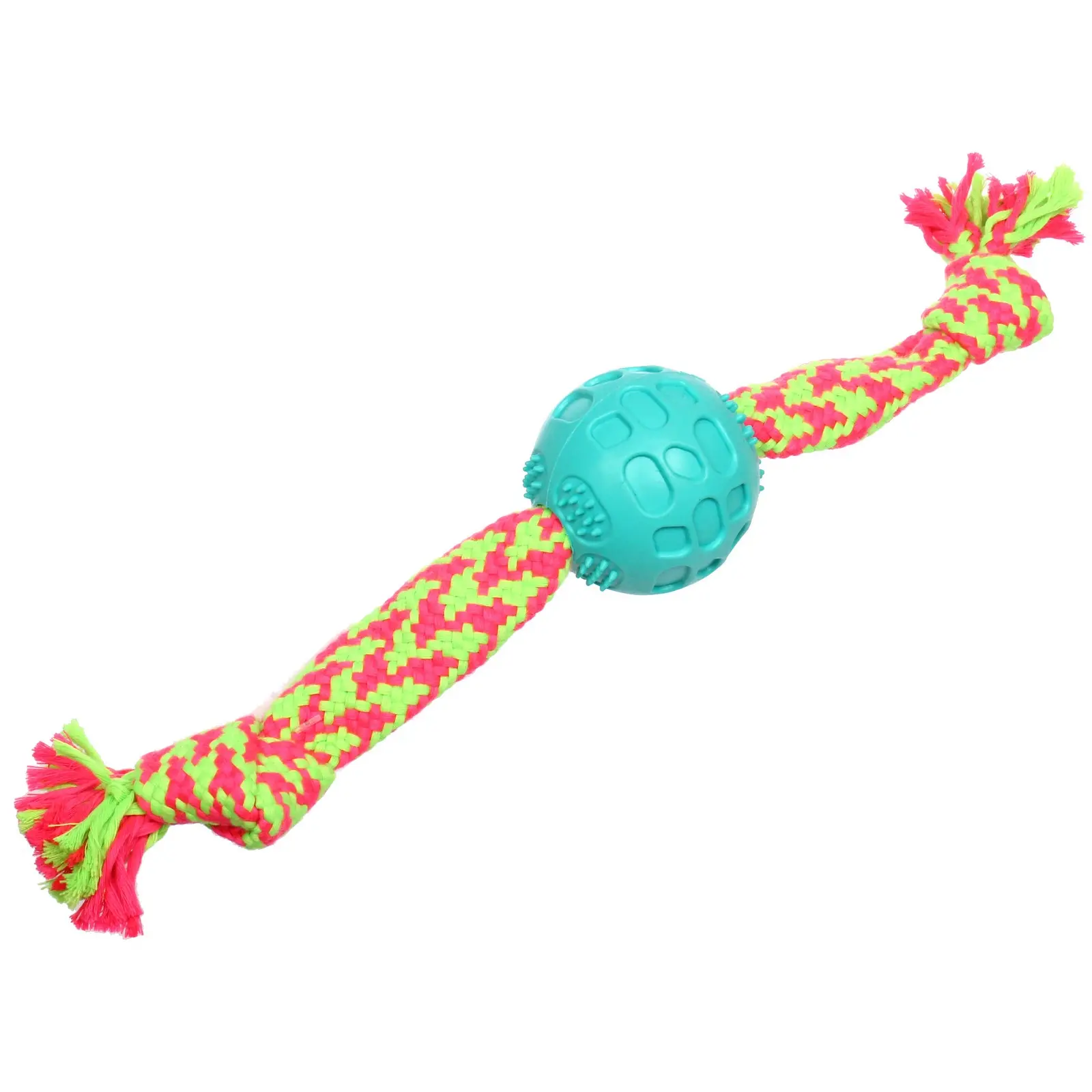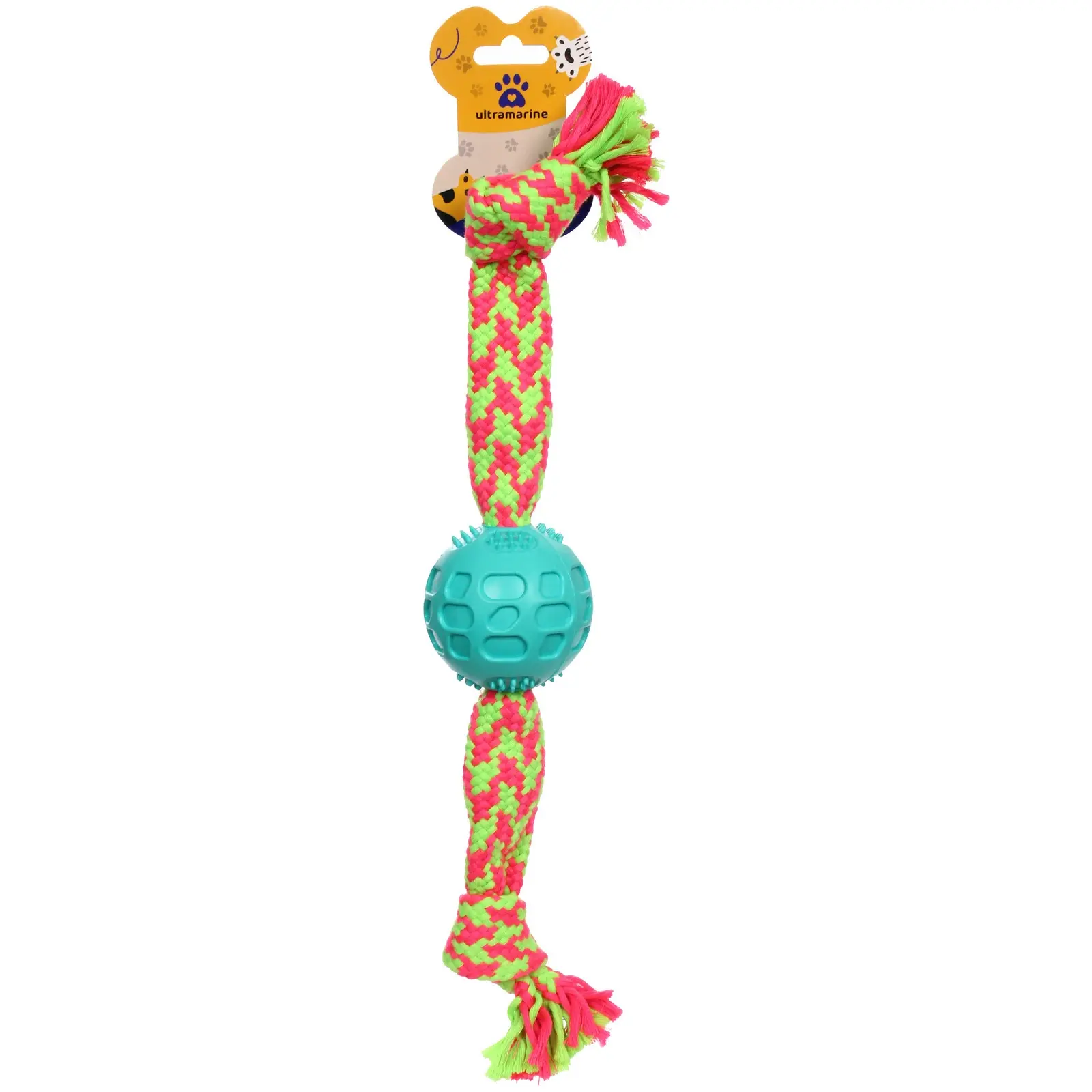Игрушка изготовлена из качественных материалов: прочный текстильный канат выдерживает активные игры, а резиновый мячик сохраняет форму даже при интенсивном использовании. Размеры 40х6 см идеально подходят как для маленьких, так и для крупных собак.