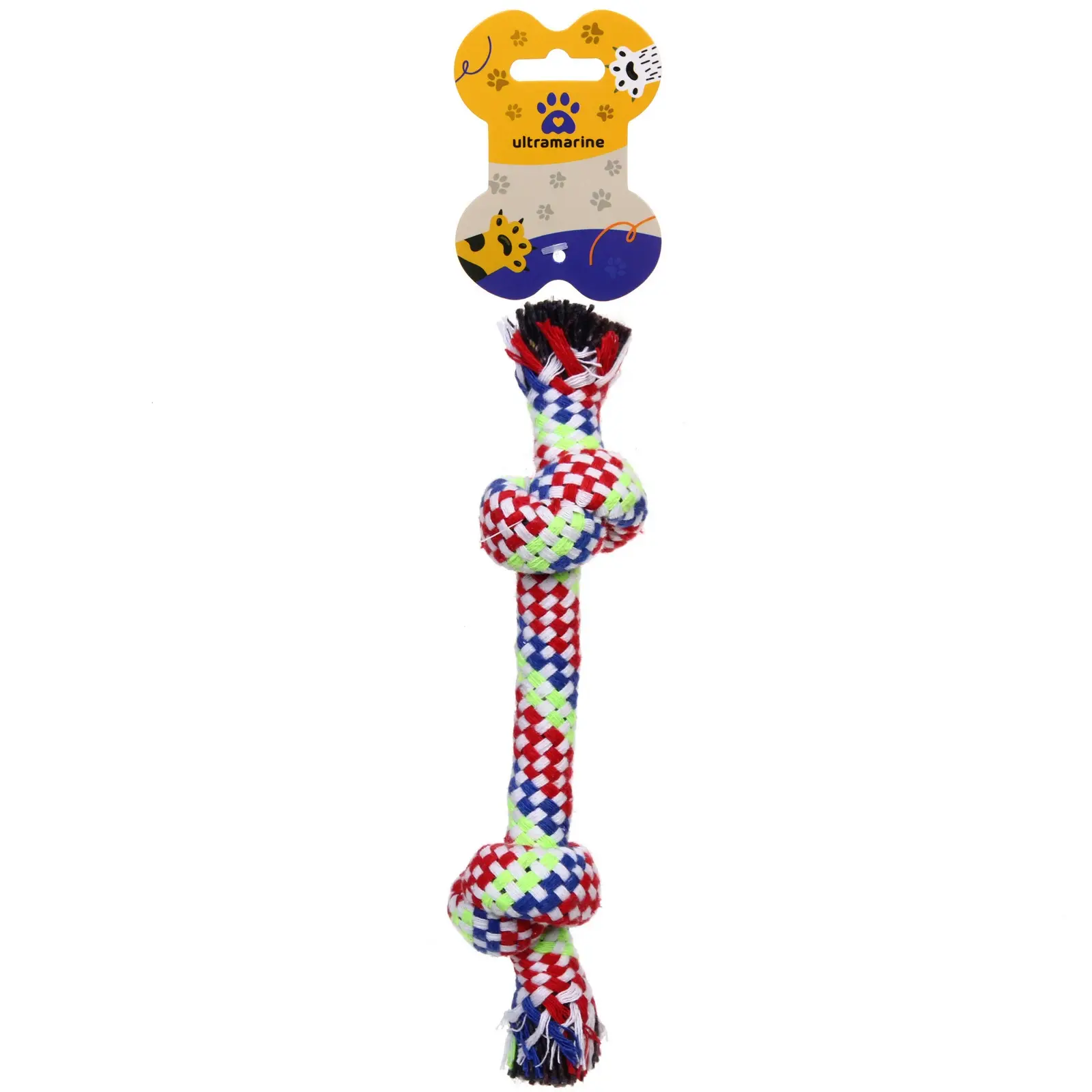 Изготовлено из прочных хлопковых нитей, сплетённых в плотную верёвку. Разноцветный узор делает игрушку привлекательной, а крепкие узлы позволяют собаке легко удерживать и активно играть. Отгружается один товар, цвет определяется случайным образом.
