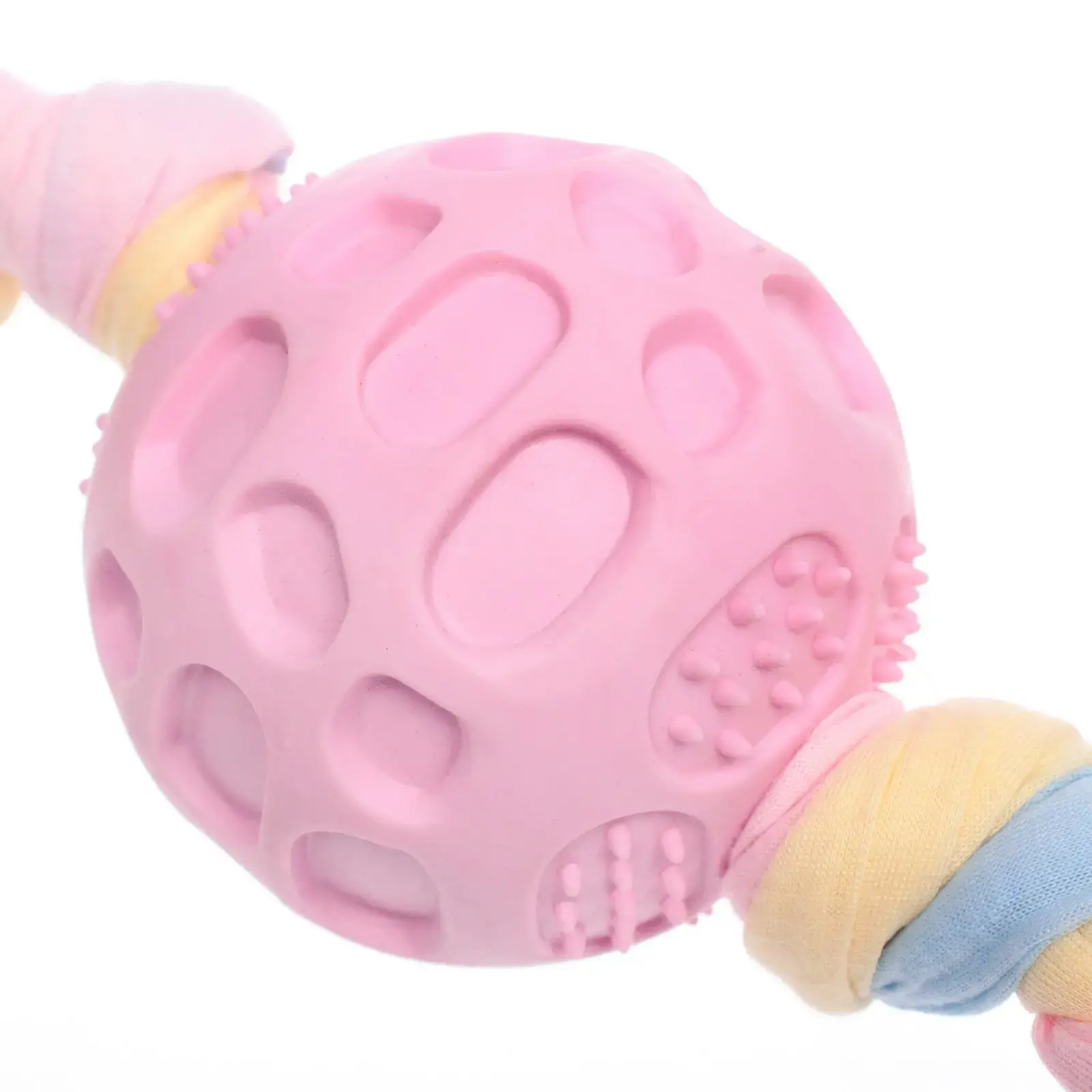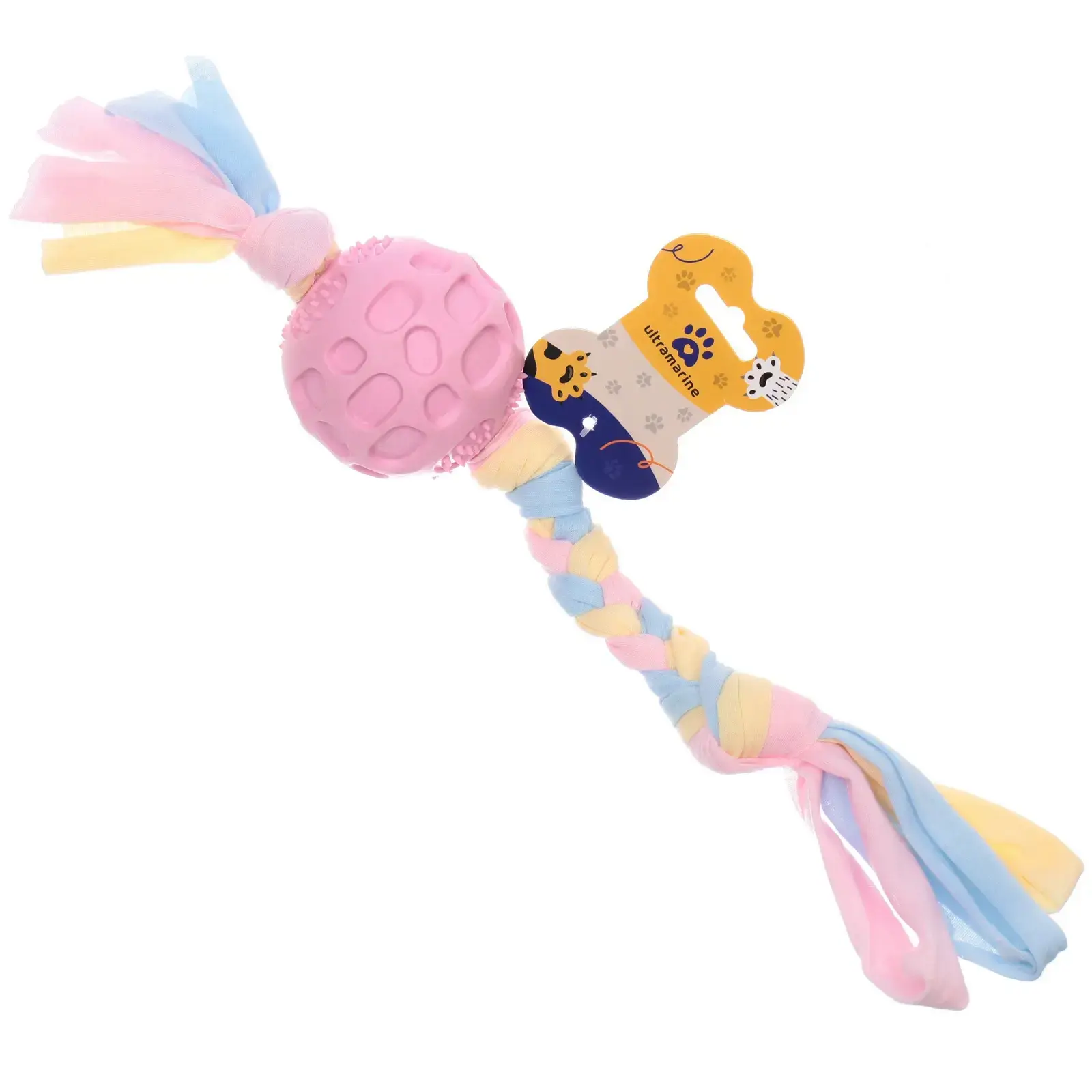 Игрушка имеет размеры 38 см в длину и 7,5 см в диаметре, что делает её удобной для захвата. Мячик выполнен из резины, а канат из прочного текстиля, что обеспечивает надежность и безопасность во время игры. Ярко-розовый цвет игрушки добавляет веселья в каждую игру.
