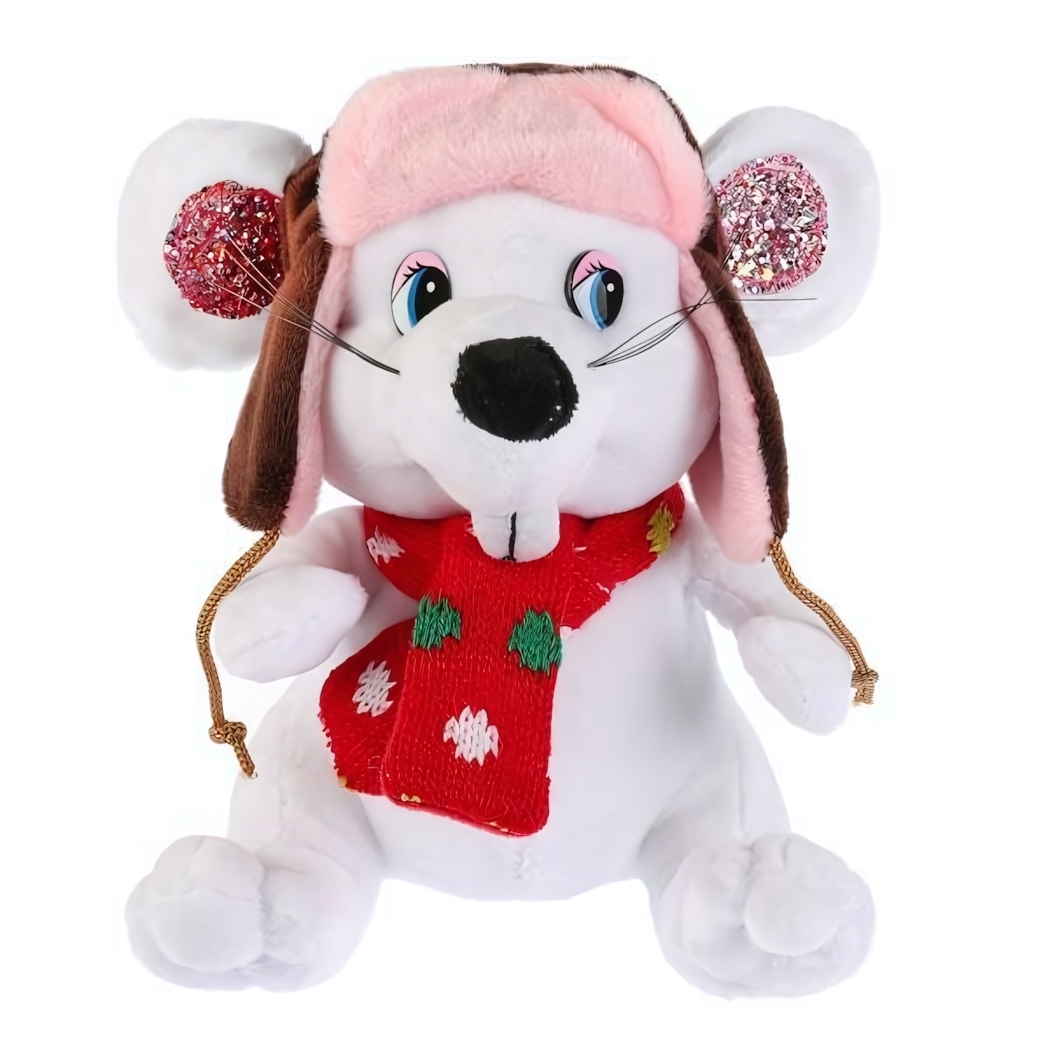Мышка мягкая белая 15см с блестящими ушами, в розовой ушанке и шарфом