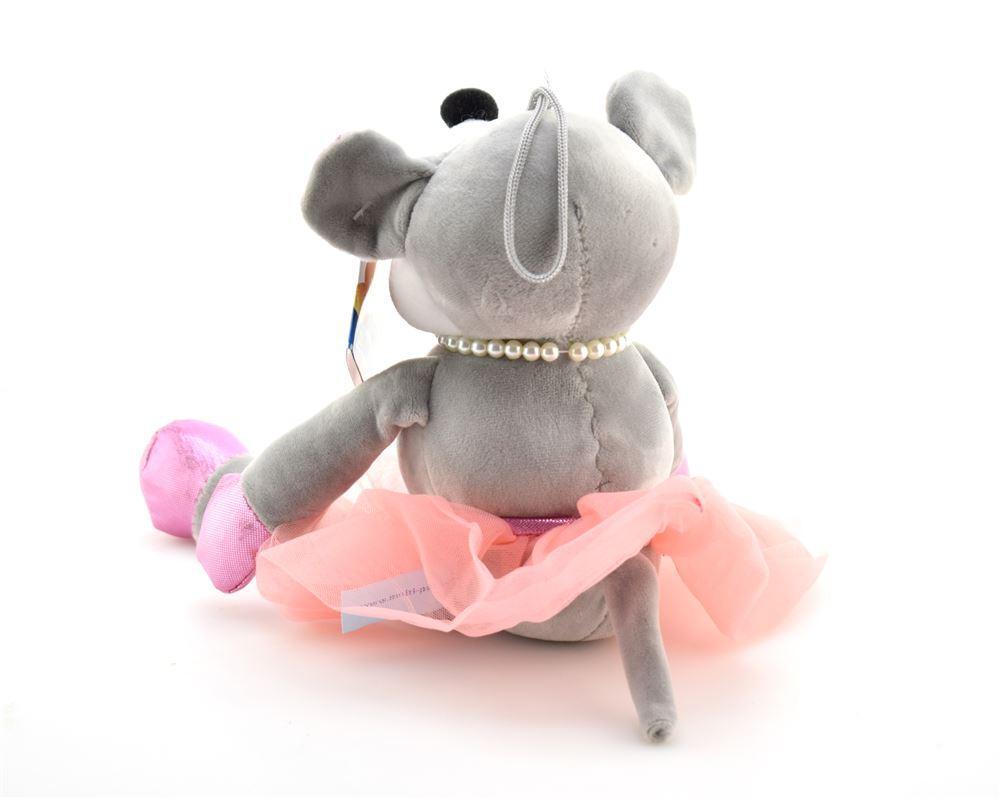 Размер игрушки составляет 17 см, что делает ее удобной для переноски и хранения. Серый цвет с розовыми элементами, включая юбку и обувь, придает игрушке особый шарм. Мышка также имеет петлю для подвешивания, что позволяет использовать ее как элемент декора в детской комнате.