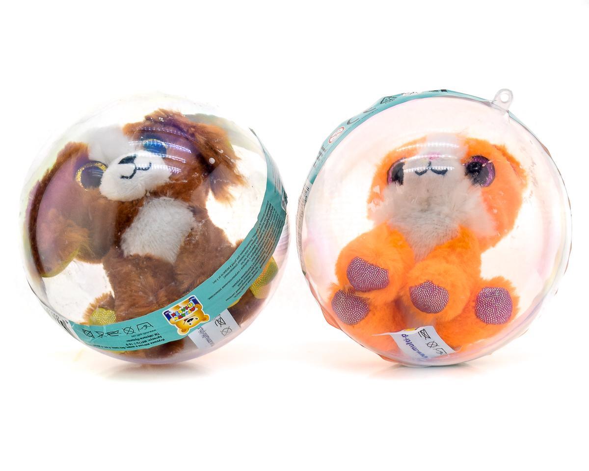 Прозрачный шар-упаковка не только защищает игрушку, но и превращает её в эффектный аксессуар. Ребёнок может выбрать очаровательную собачку с коричнево-белой шёрсткой или яркую кошечку в оранжевых тонах — оба варианта имеют выразительные глазки и дружелюбную мордочку.