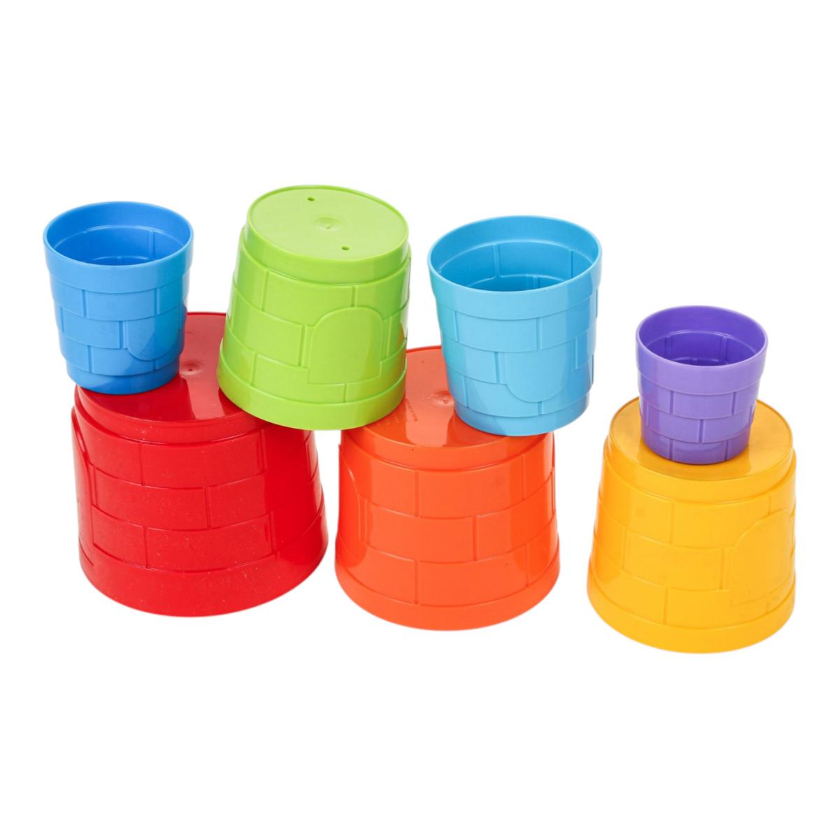 С помощью этой пирамидки ребенок учится сравнивать предметы по величине (больше — меньше), знакомится с основными цветами радуги и тренирует мелкую моторику рук. Каждый стаканчик имеет цилиндрическую форму и уникальный рельефный узор, имитирующий кирпичную кладку, что делает поверхность приятной на ощупь и развивает сенсорику. На некоторых элементах нанесены изображения арок, что позволяет ребенку фантазировать и строить сказочные замки.
