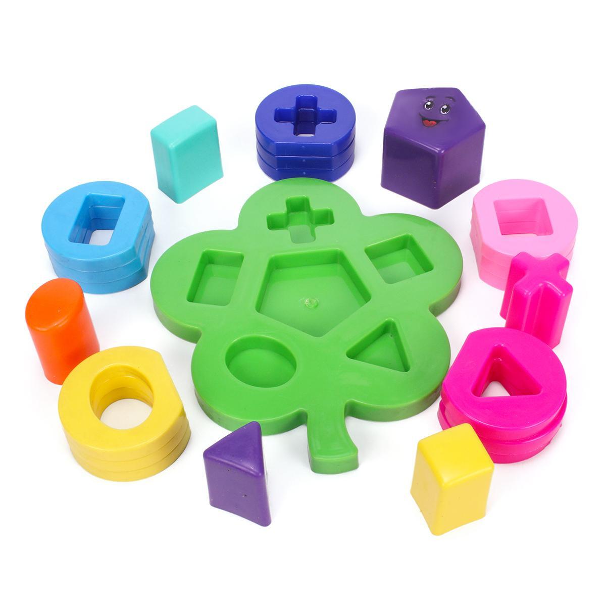 Игрушка включает: зеленую основ-платформу в форме цветка, 5 объёмных геометрических фигур (куб, цилиндр, призма и другие) и 10 плоских колец с отверстиями разных форм. Все элементы выполнены из прочного пластика в насыщенных цветах: желтый, синий, розовый, фиолетовый, оранжевый и зеленый.
