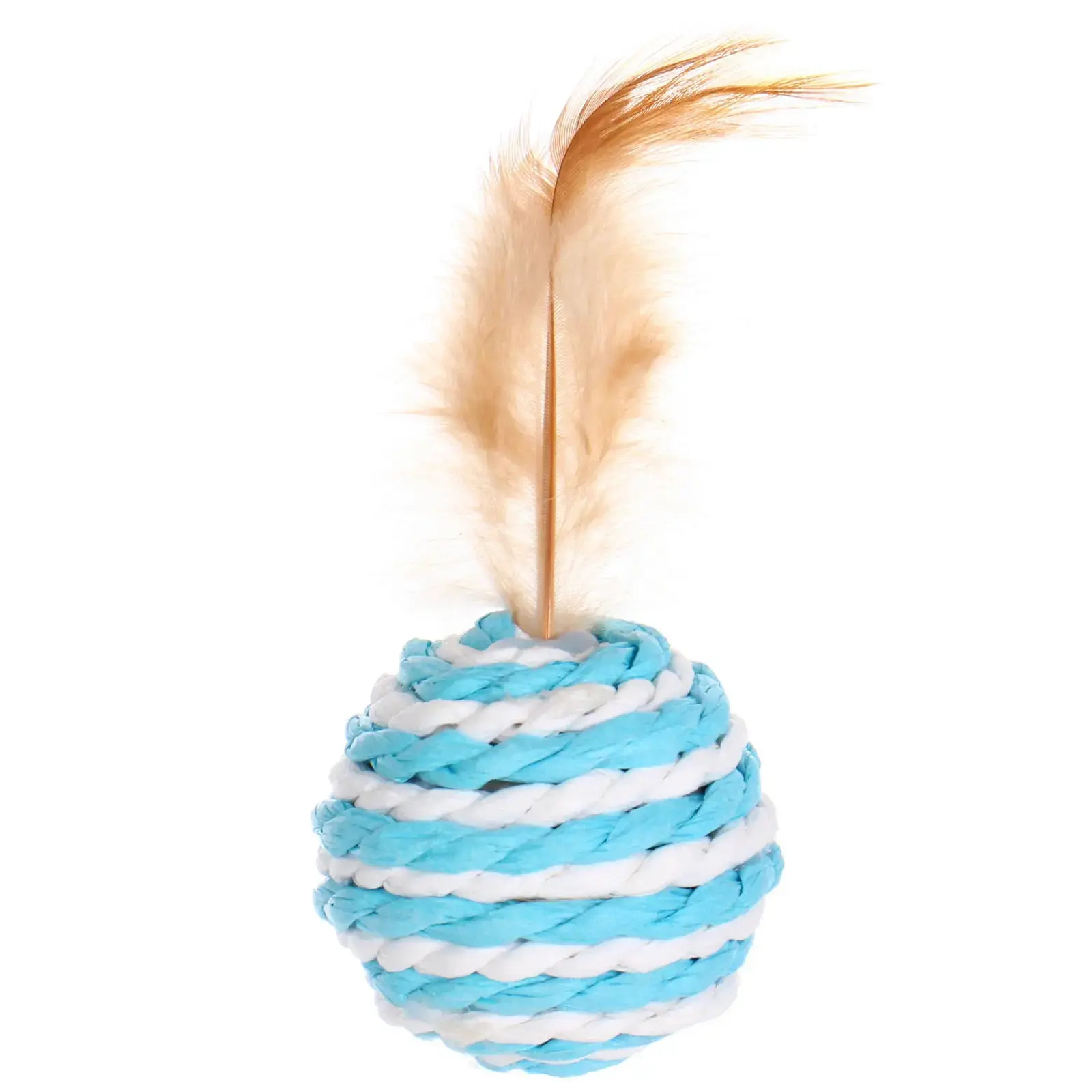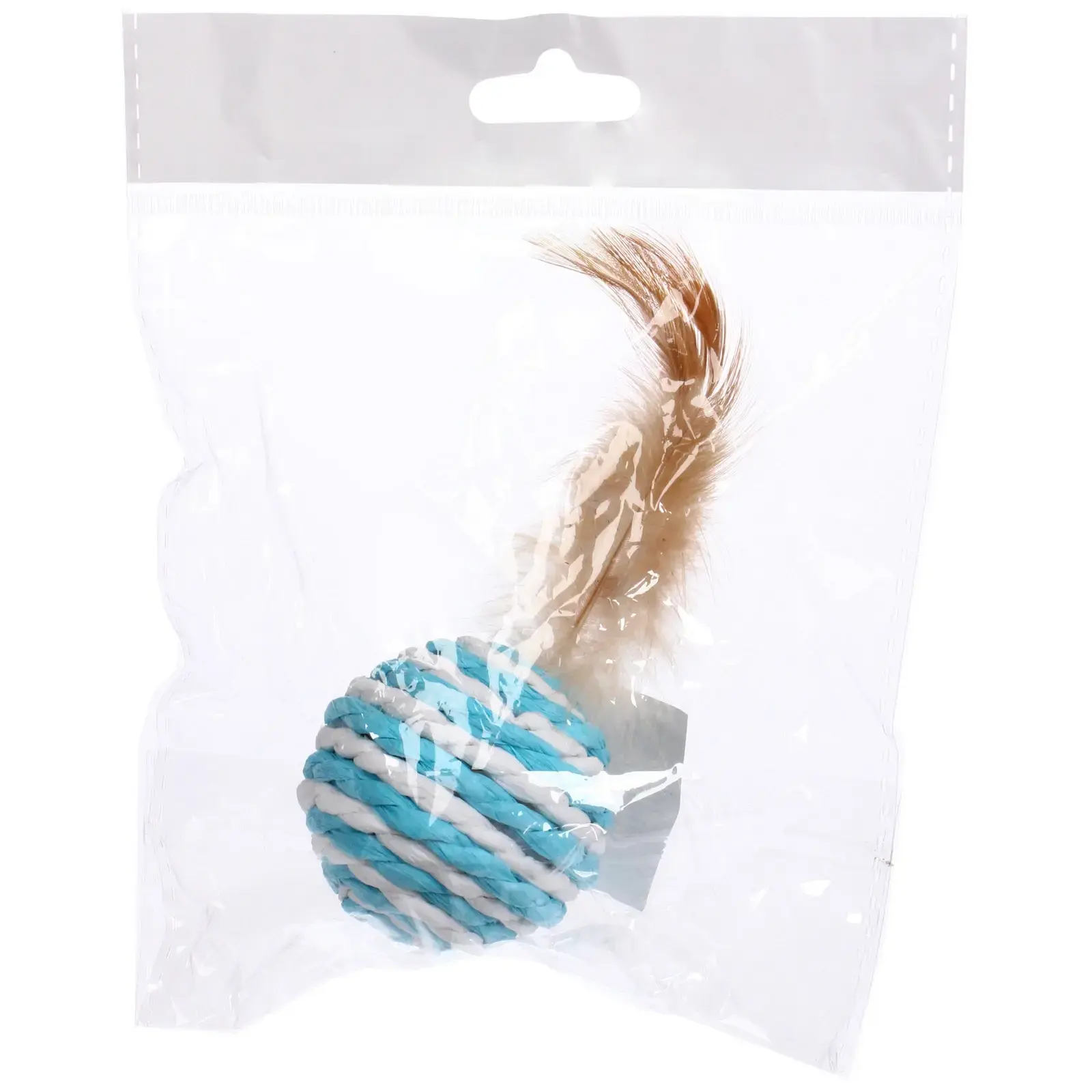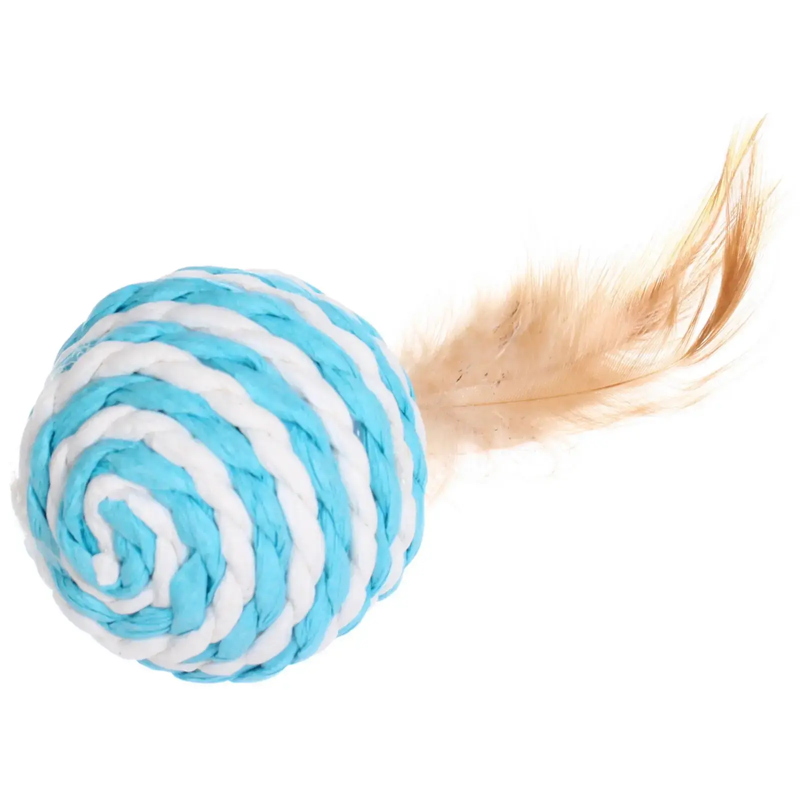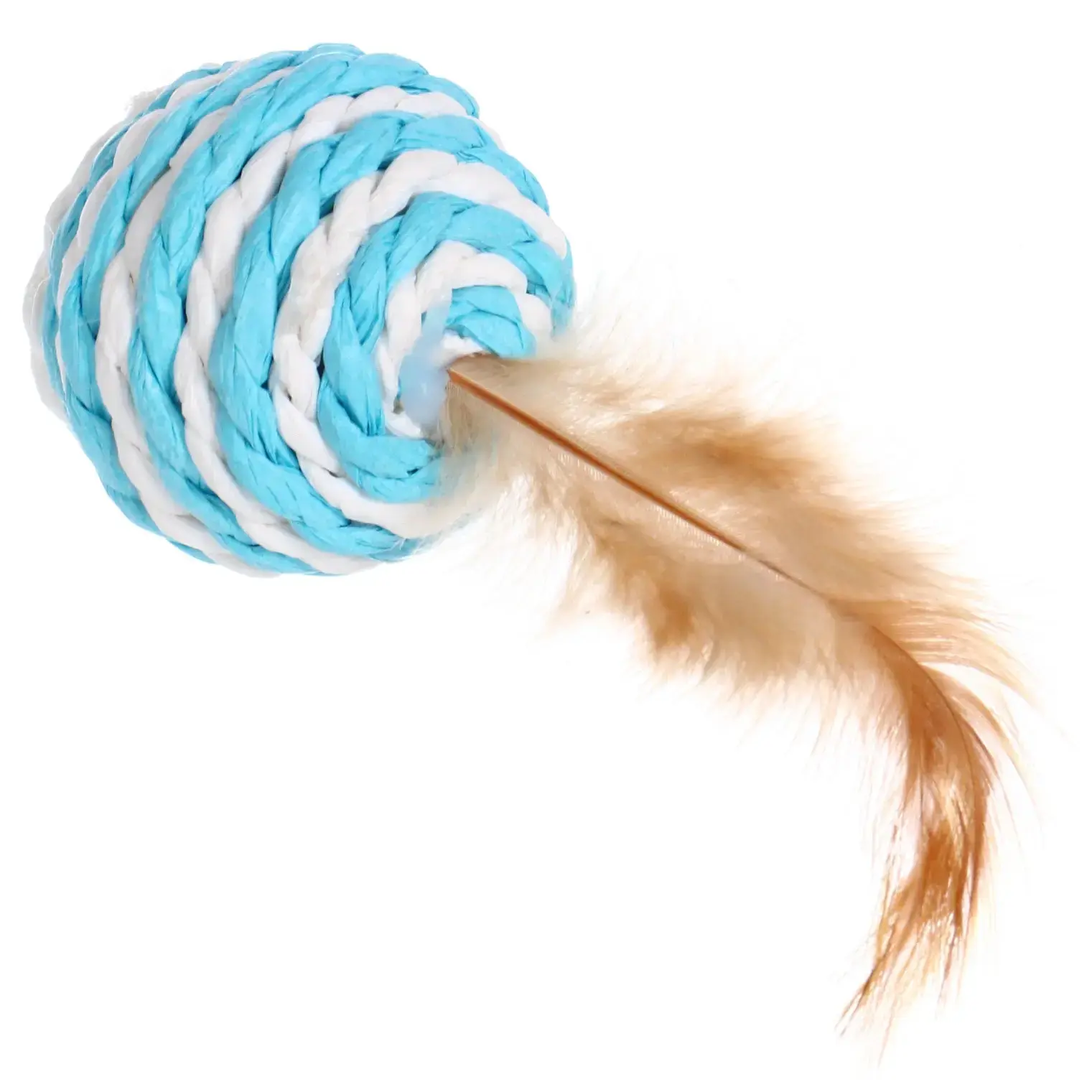Размер шарика составляет 5 см в диаметре, а общая длина с перышком — 10 см. Игрушка выполнена из переплетенных материалов, что делает ее легкой и удобной для игры. Шарик подходит для всех пород кошек и станет отличным подарком для вашего пушистого друга.