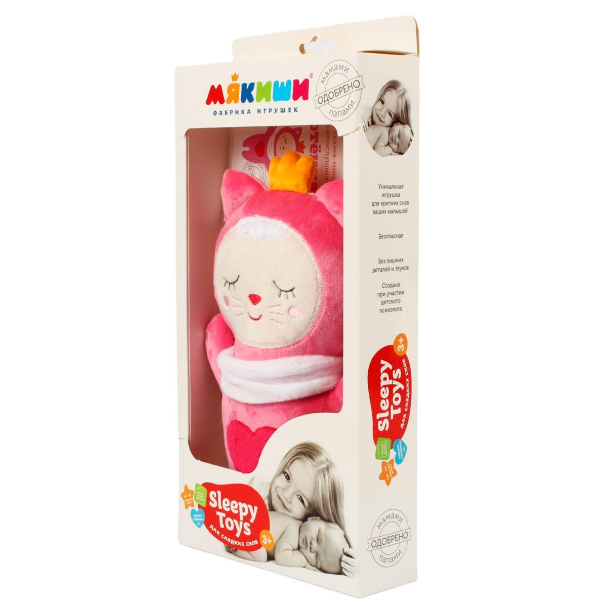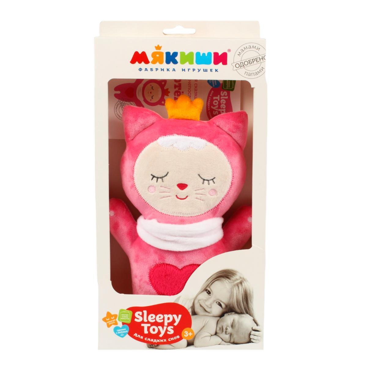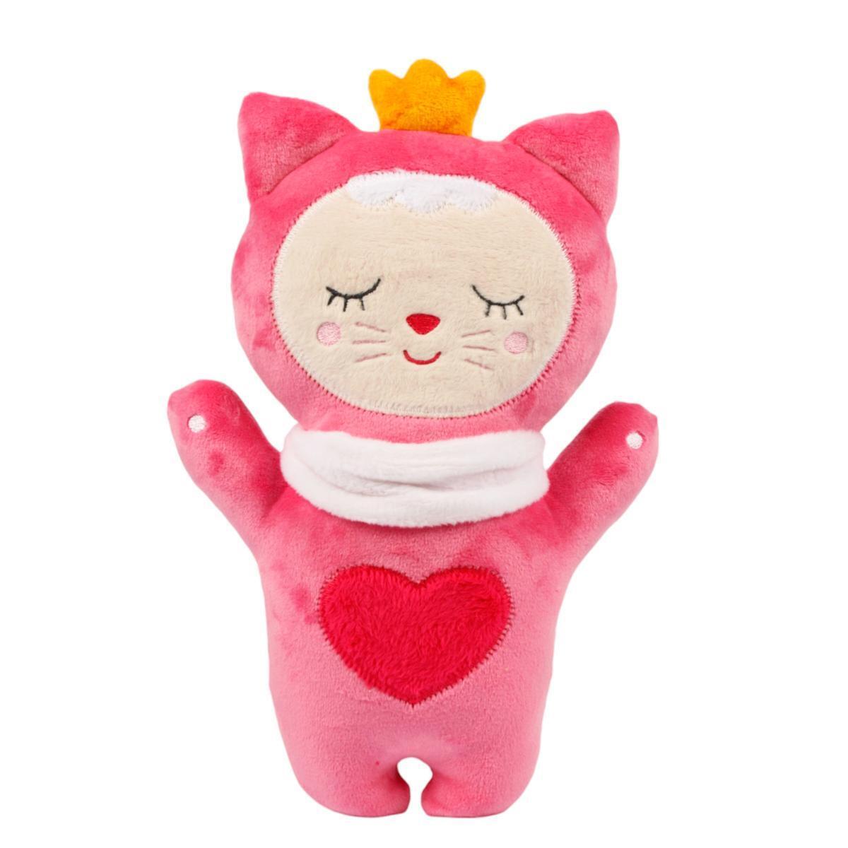 Игрушка выполнена в розовом цвете с белыми и красными элементами, что делает ее яркой и привлекательной. На груди у котенка расположено красное сердечко, а на голове — корона оранжевого цвета. Игрушка имеет компактные размеры, что позволяет легко держать ее в руках. 'Sleepy Toys' — это не просто игрушка, а настоящий друг для вашего малыша!