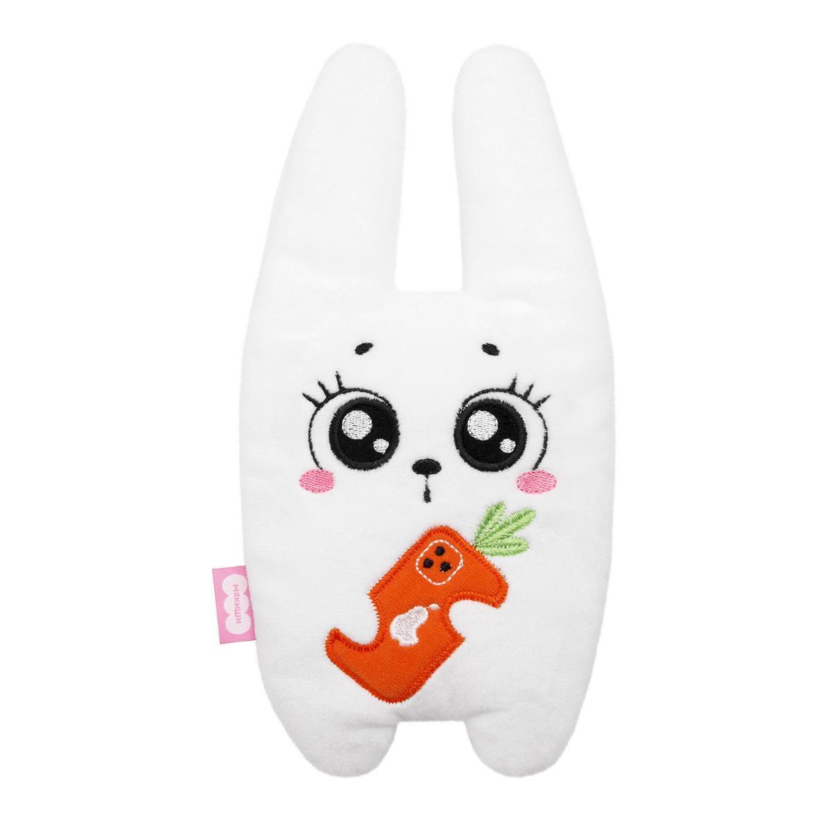 Игрушка выполнена в белом цвете с черными и розовыми элементами, имеет дружелюбный дизайн и форму зайца с длинными ушами. В лапках игрушка держит морковку, что добавляет ей игривости. Это идеальный подарок для новорожденных, который сочетает в себе функциональность и эстетическую привлекательность.
