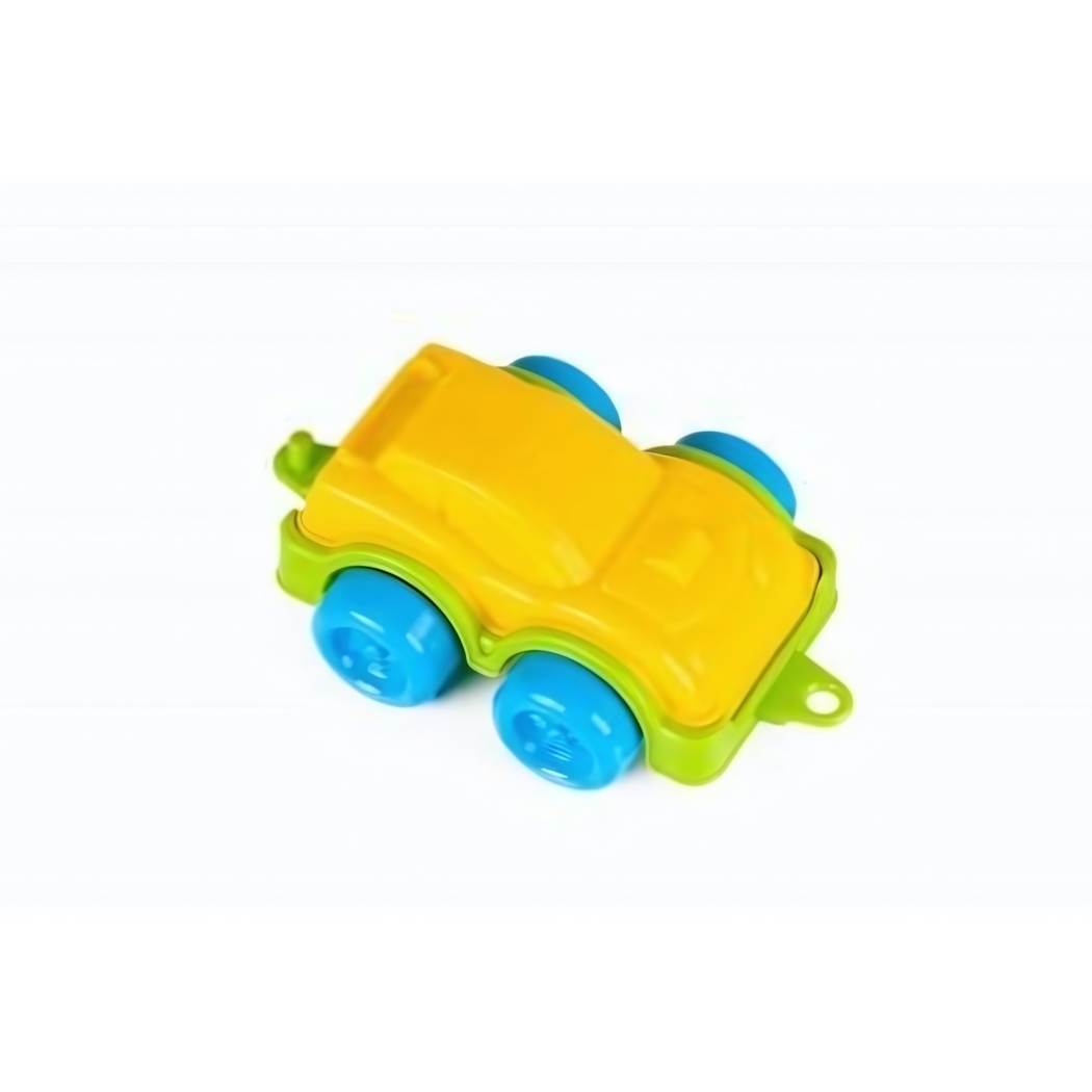 Машинка выполнена в классической форме автомобиля с ярким желтым кузовом и синими колесами. Размеры средние, что делает ее удобной для детской руки. Игрушка не имеет мелких деталей, что обеспечивает безопасность во время игры.